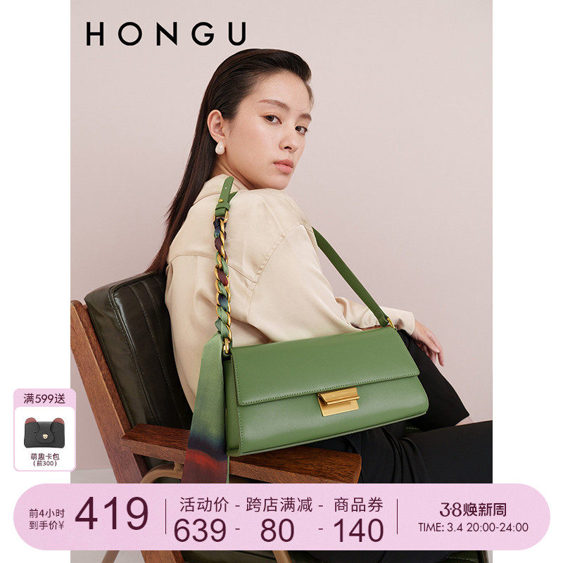 红谷包包2024新款牛皮复古单肩包小众设计丝巾链条腋下包手提女包