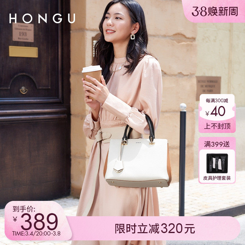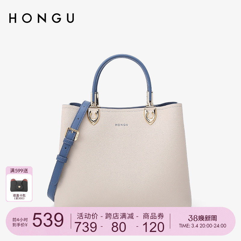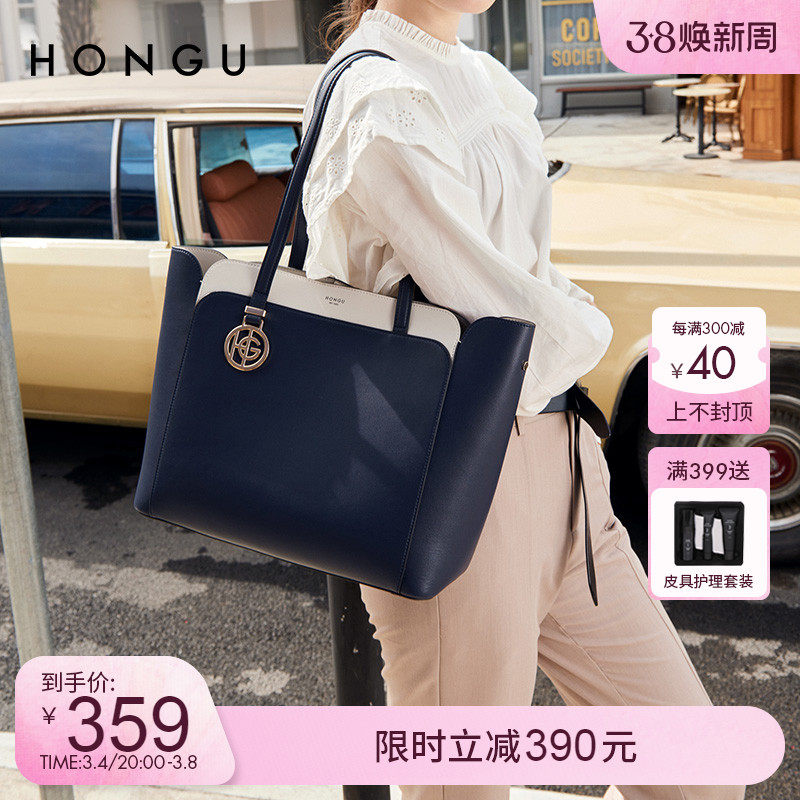 红谷包包新款撞色牛皮单肩手提包通勤大容量手拎包气质女士包大包