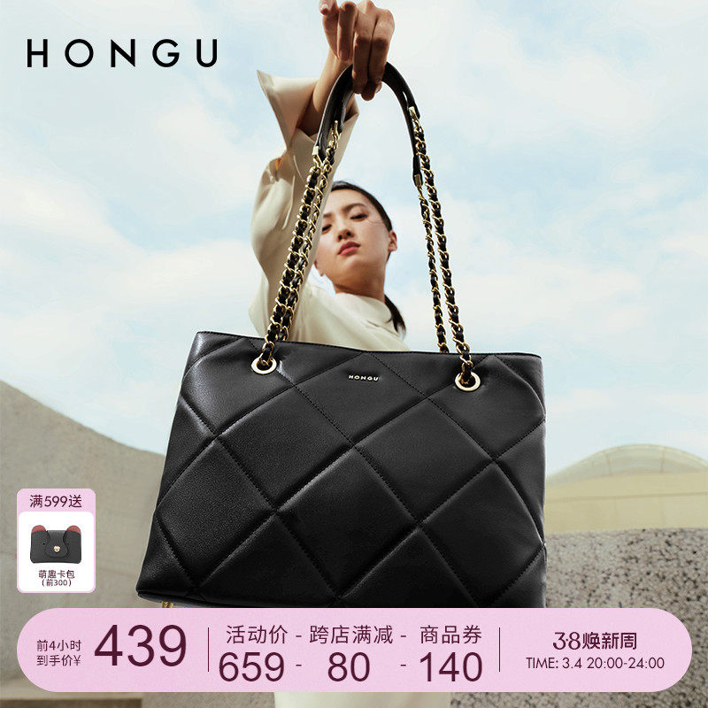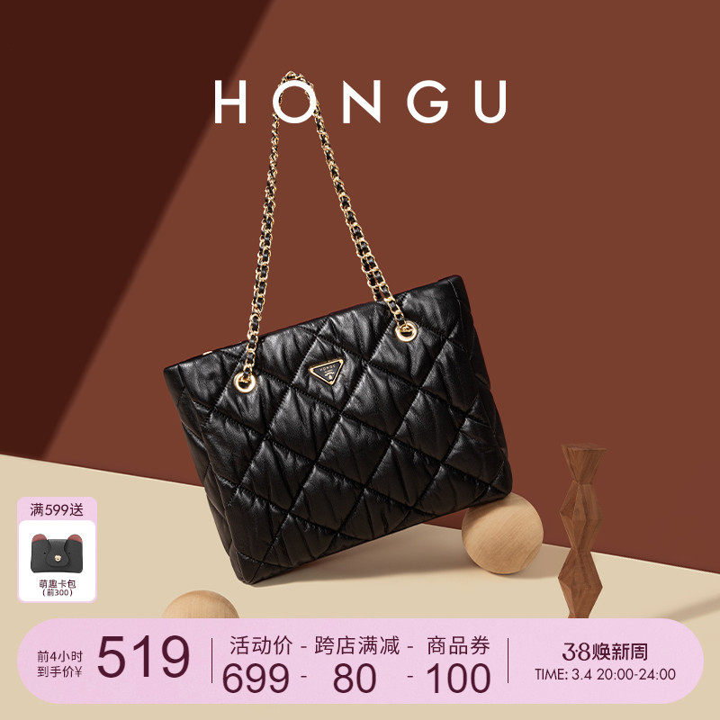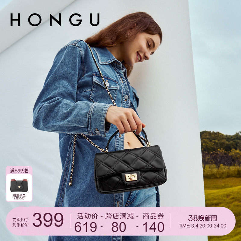 红谷包包2024新款牛皮单肩斜挎包时尚菱格链条包手提小方包女士包