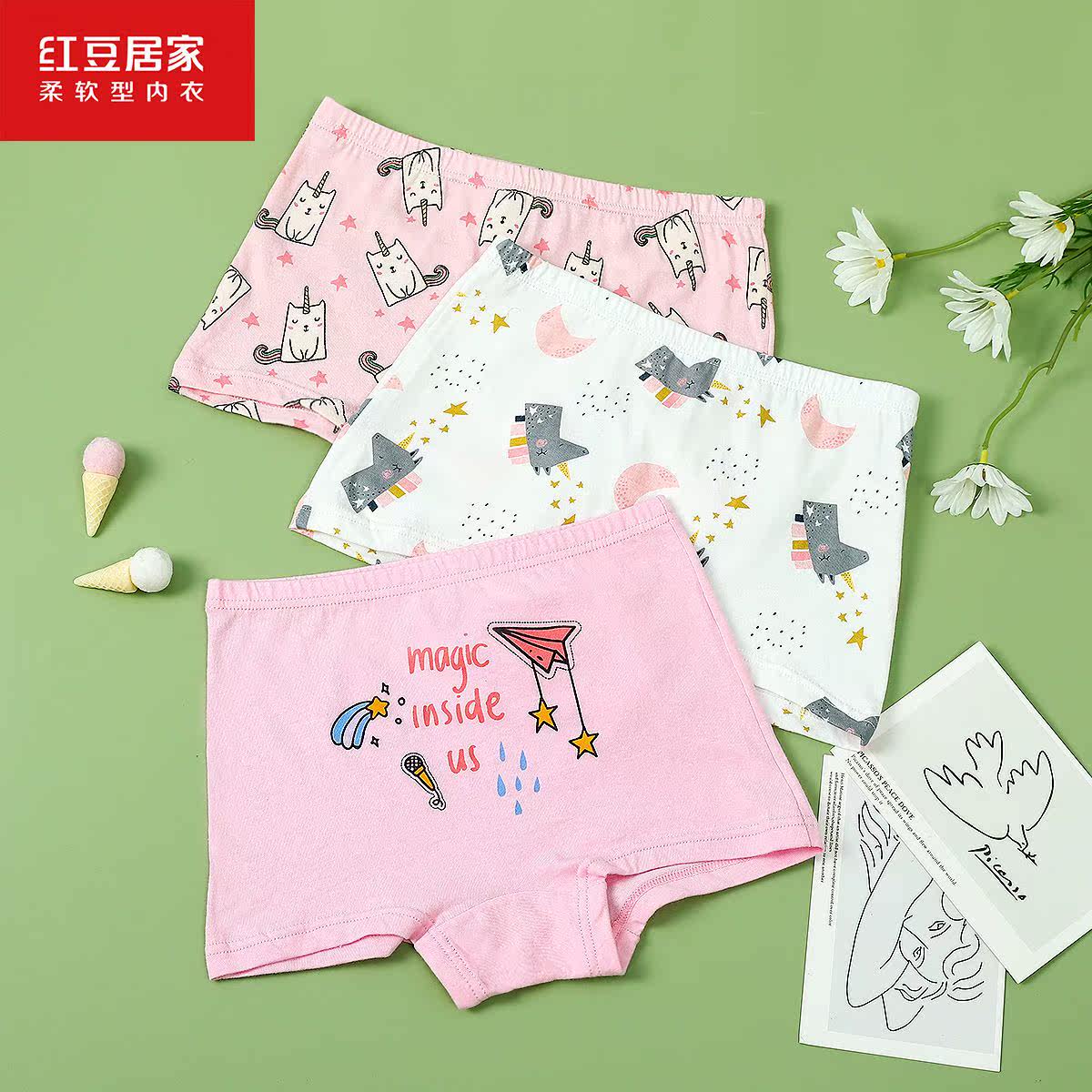 红豆居家3条装纯棉女童内裤童趣印花女童平角裤双层底裆舒适透气