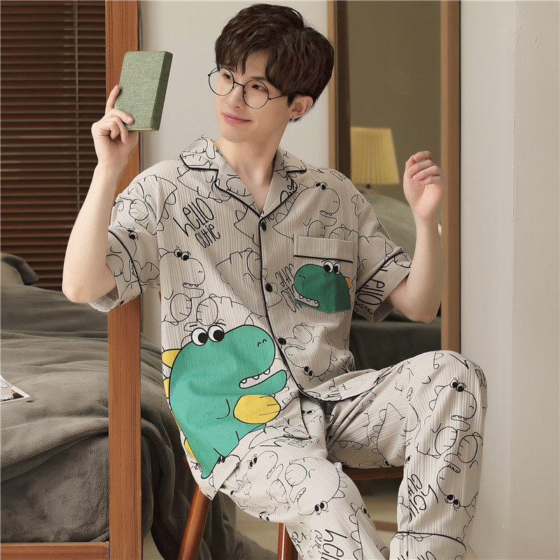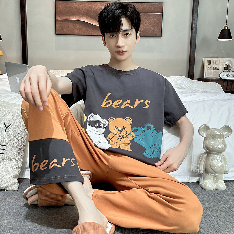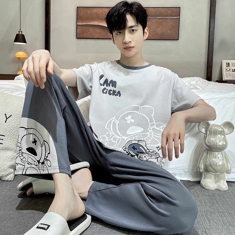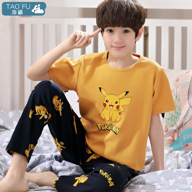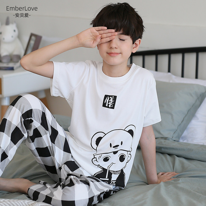 红豆青少年睡衣男夏季薄款短袖长裤卡通纯棉初中学生大童可爱卡通