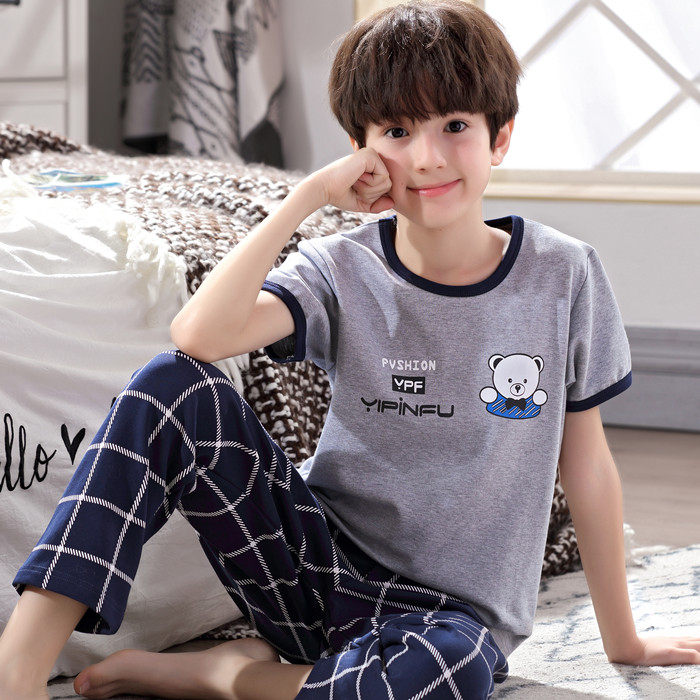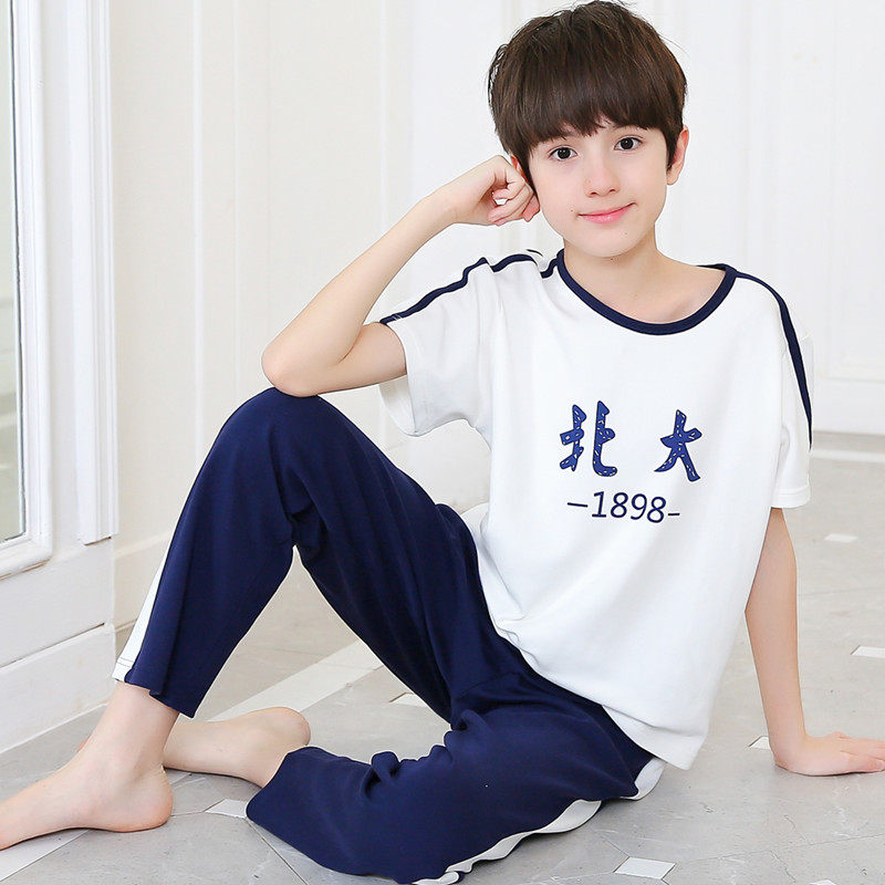红豆中大童睡衣男孩夏季纯棉短袖长裤薄款青少年高初中学生家居服