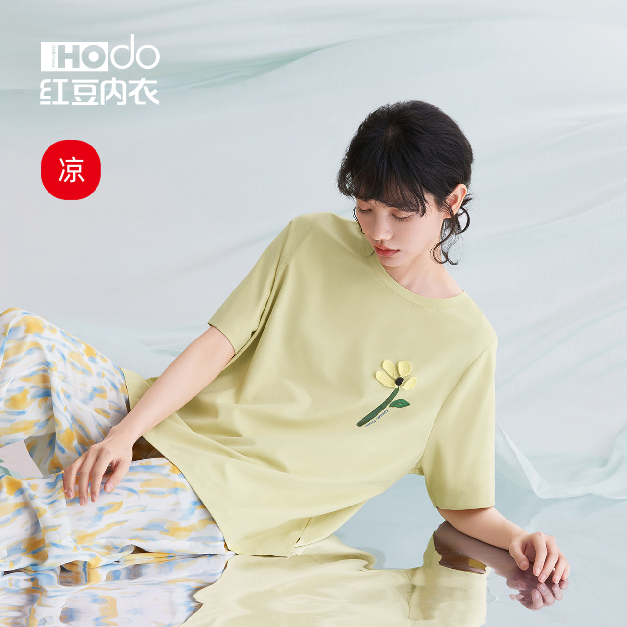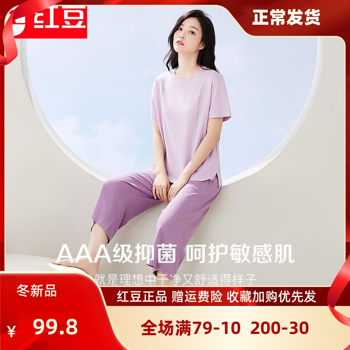 红豆居家夏季薄款女士抑菌纯棉质睡衣短袖七分裤家居服套装可外穿