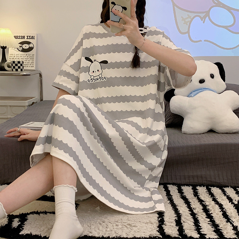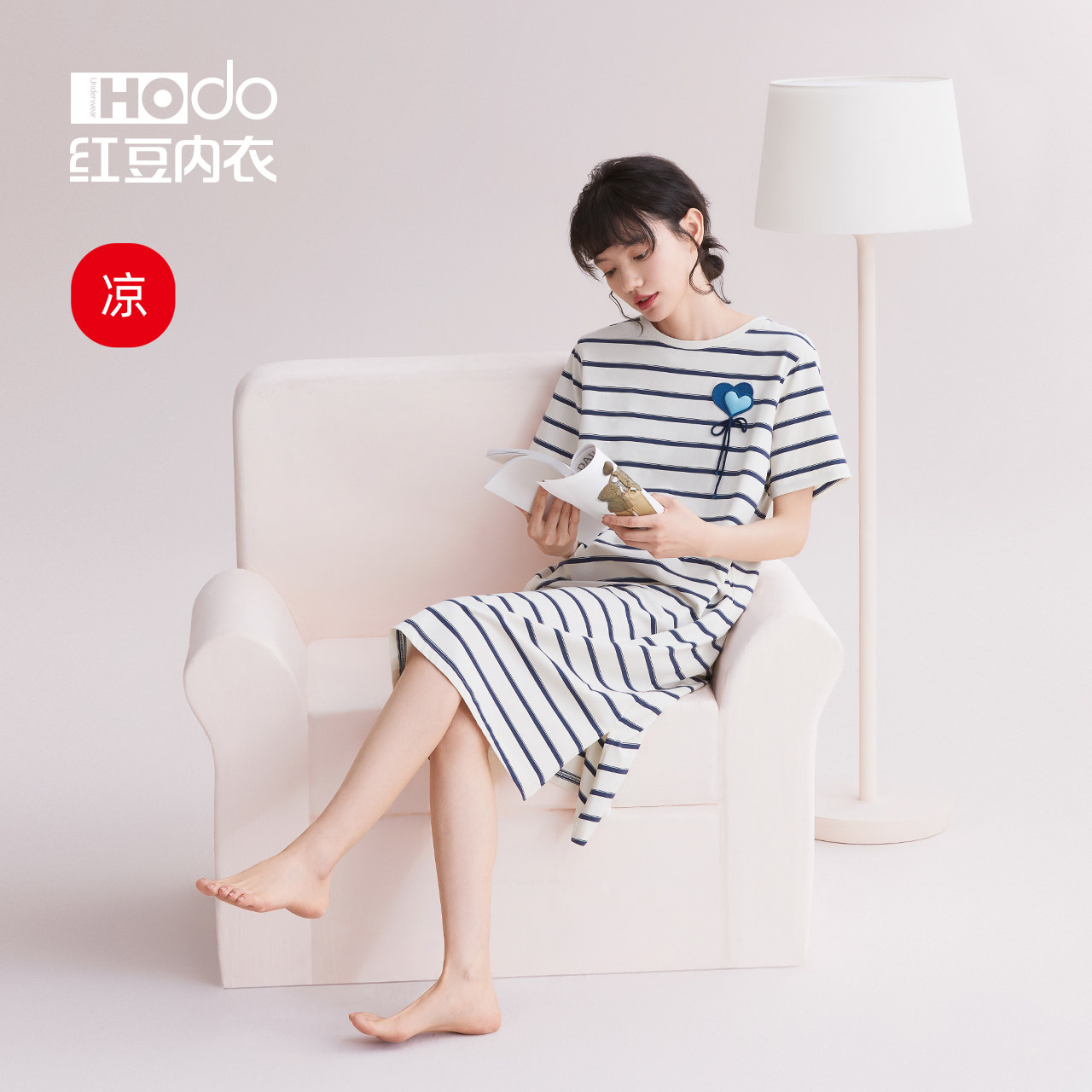 红豆女士睡裙夏条纹棉睡衣薄凉感短袖高级感大码宽松可外穿居家服