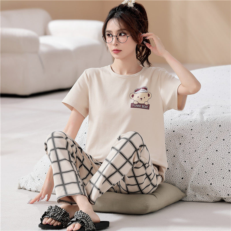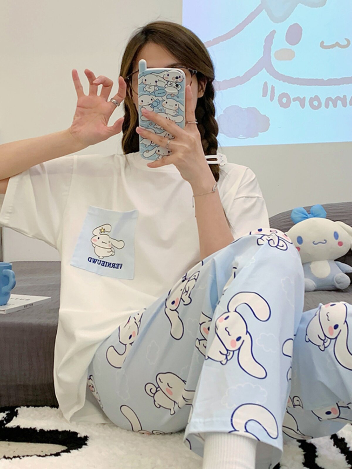 红豆睡衣女夏季新款短袖中学生清新甜美可爱卡通大码宽松长裤胖MM