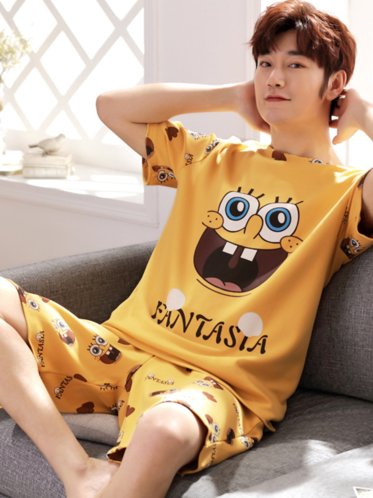 红豆睡衣男孩夏季短袖薄款纯棉卡通男士青少年学生中大童海绵宝宝