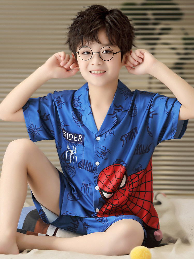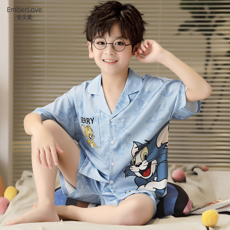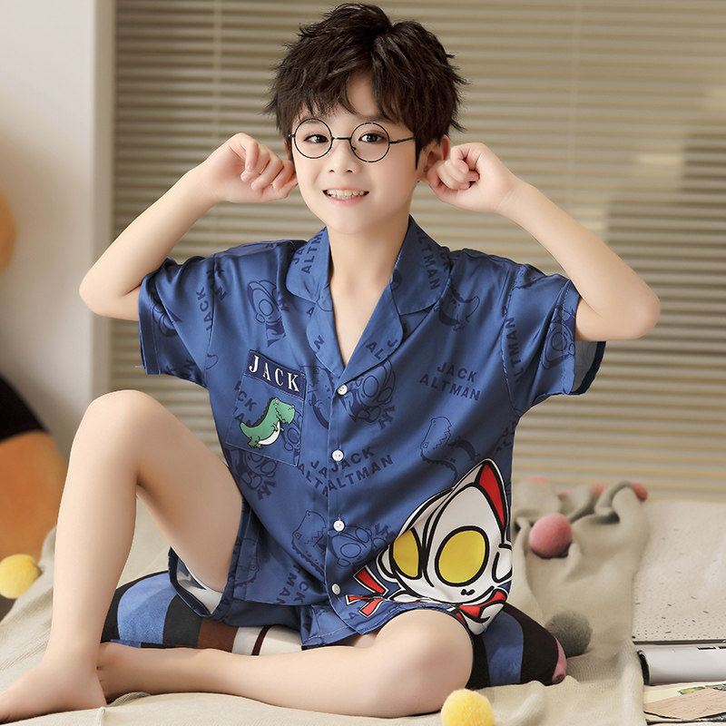 红豆居家男童睡衣儿童夏季薄款冰丝短袖宝宝男孩夏天丝绸中大童家
