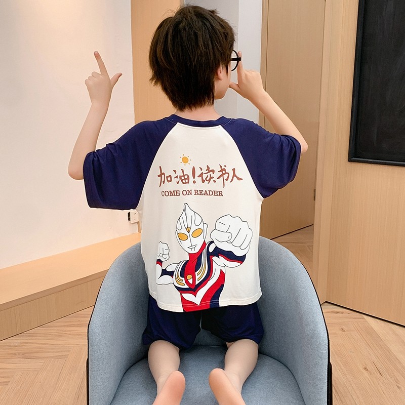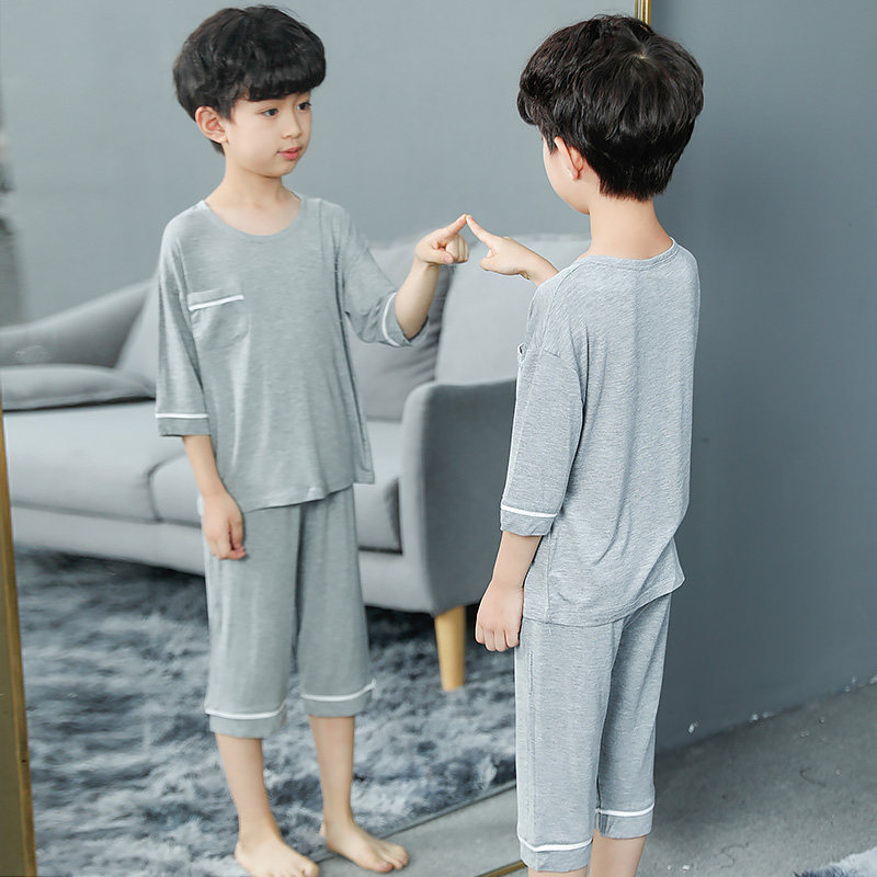 红豆莫代尔睡衣男童夏季薄款短袖青少年家居服套装中大童儿童冰丝