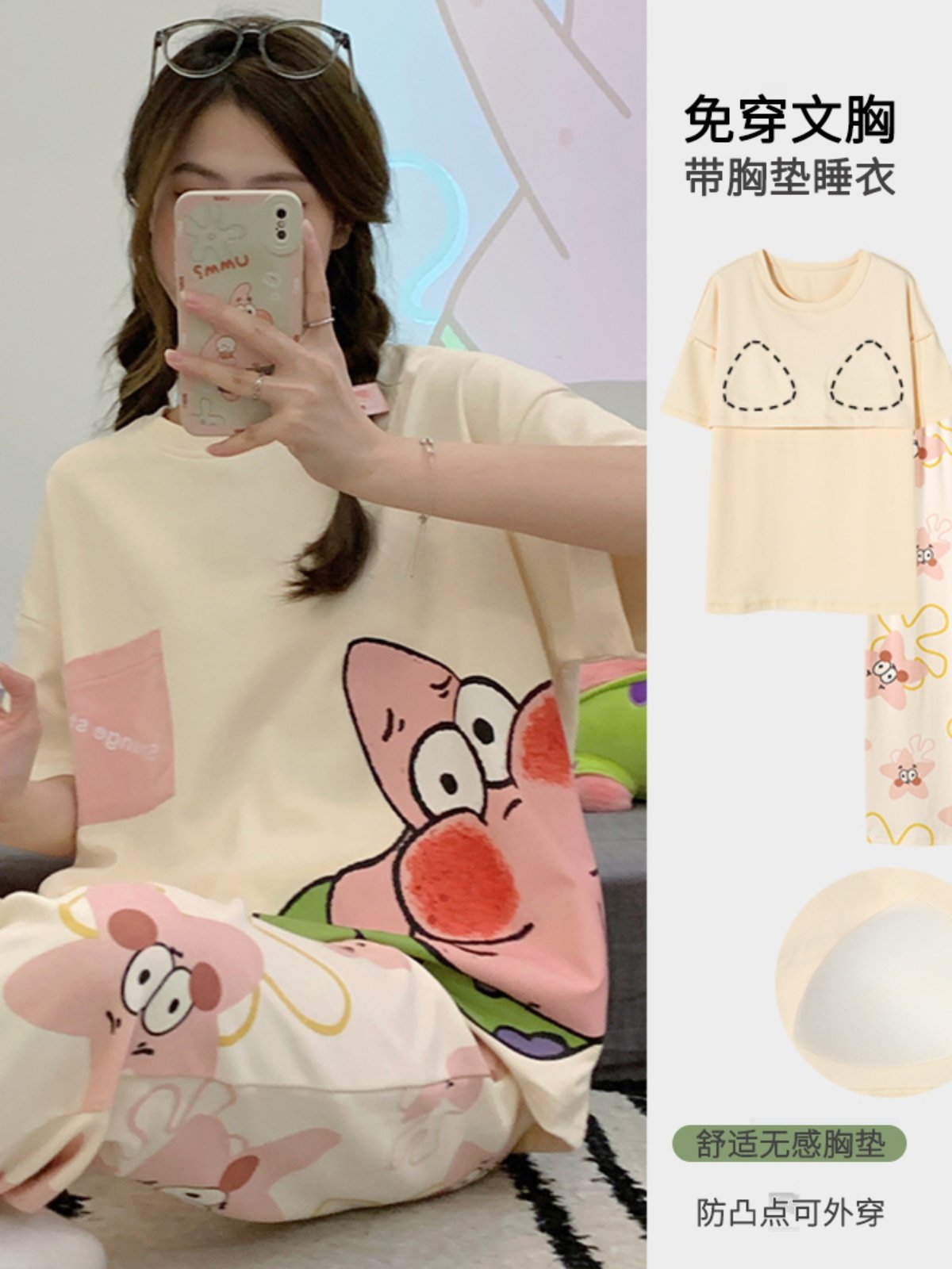 红豆带胸垫睡衣女夏季2024薄款短袖长裤防凸点初中学生大童可外穿