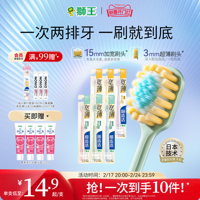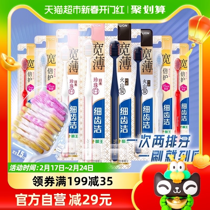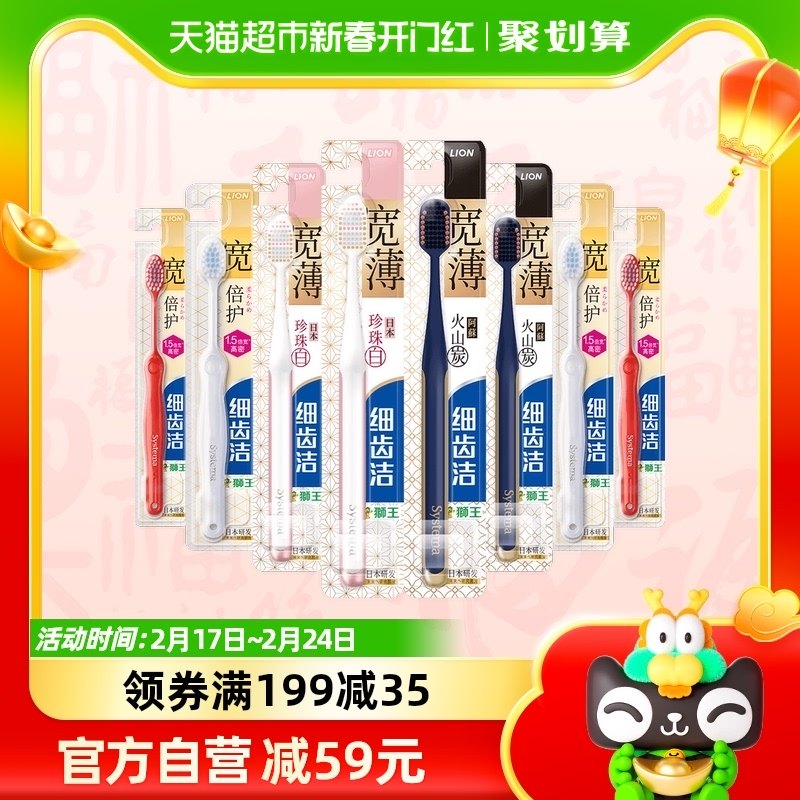 LION狮王细齿洁宽薄头牙刷软毛成人款家用61孔美牙齿白家庭装男女