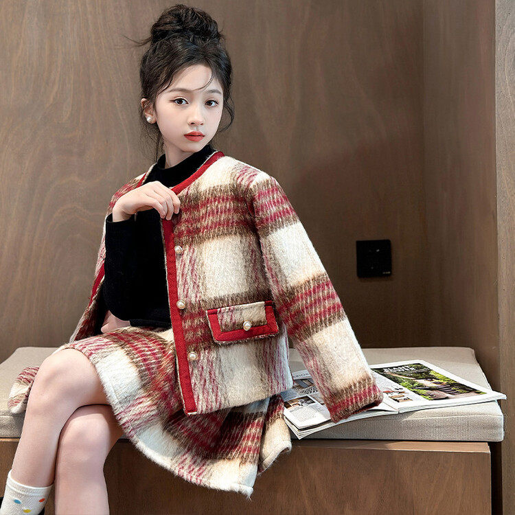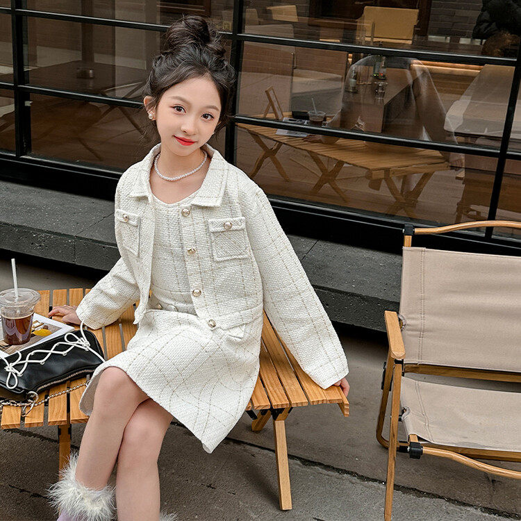 女童小香风套装2024春秋新款女孩外套加厚夹棉韩版洋气冬款新年服