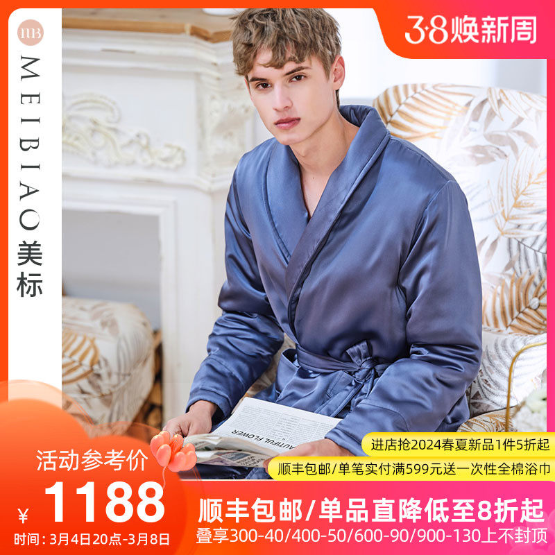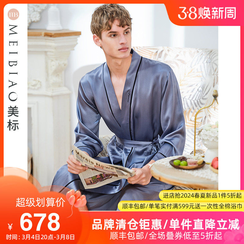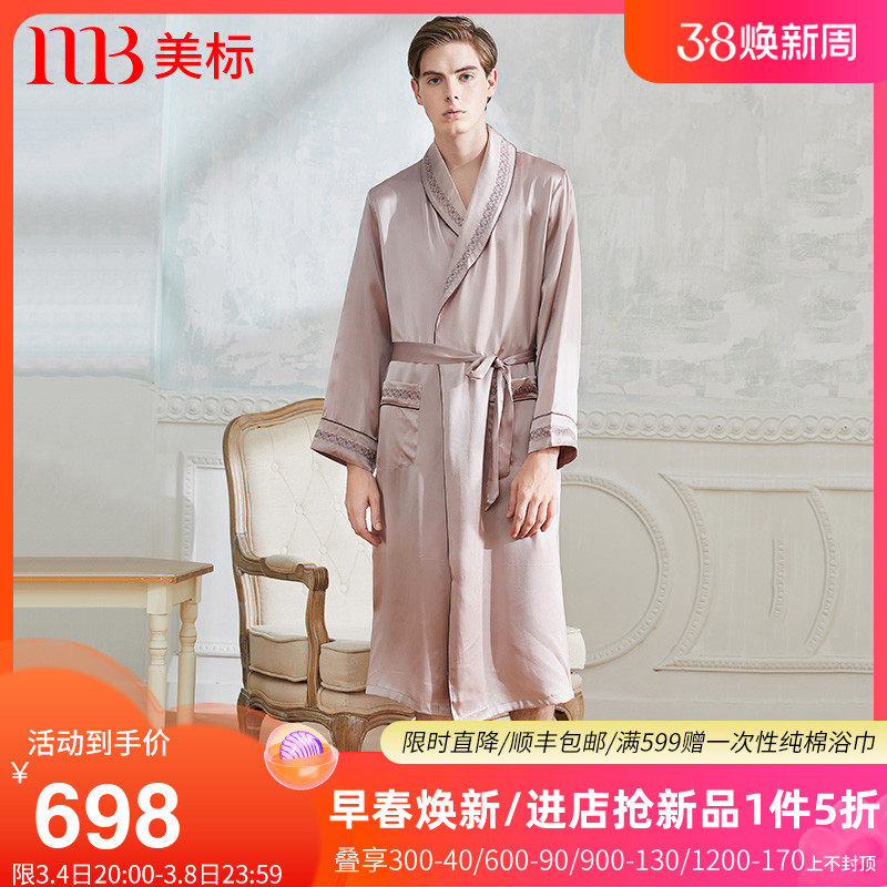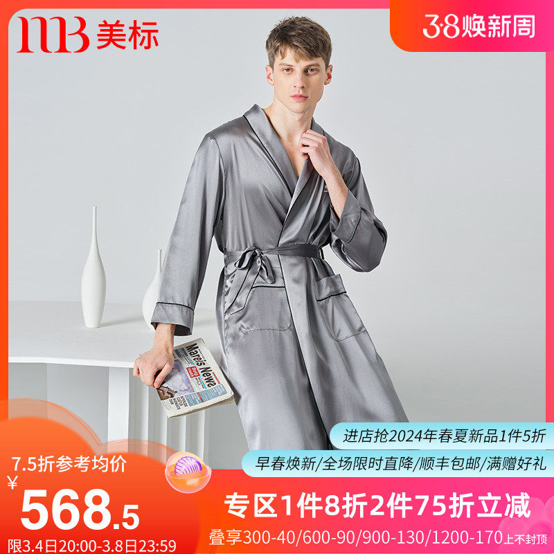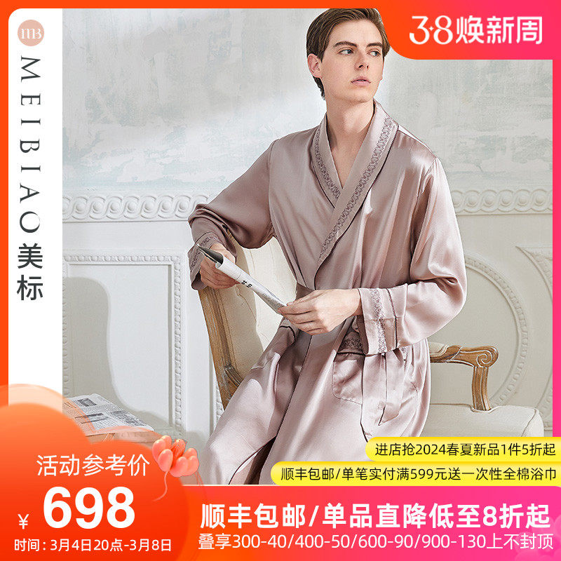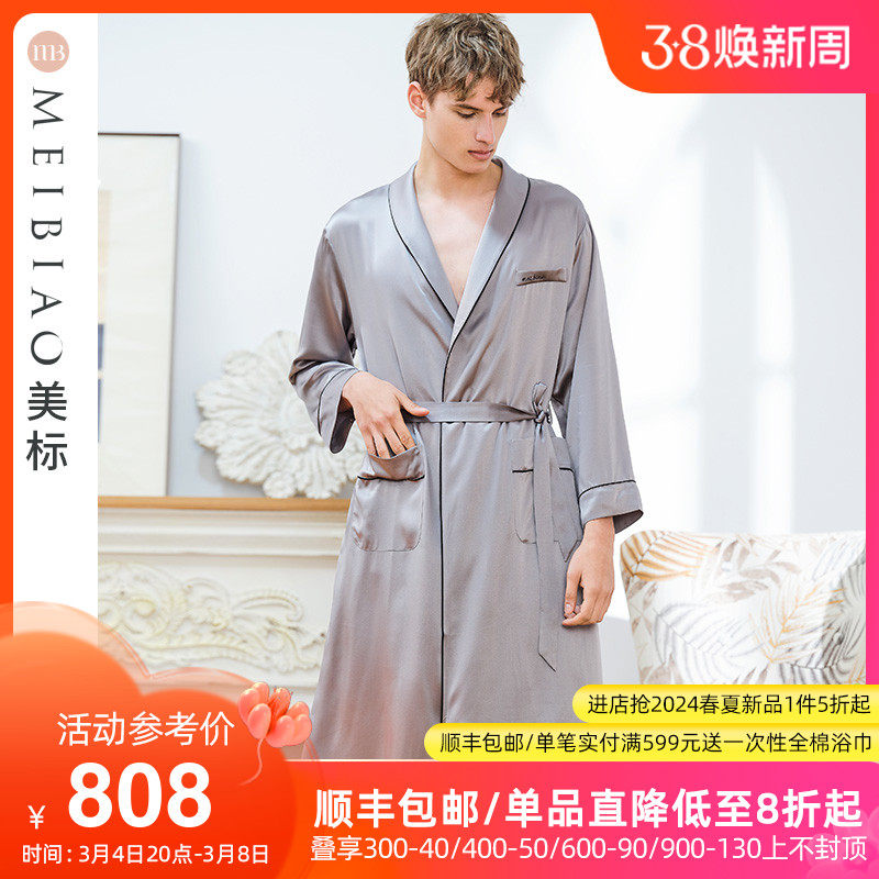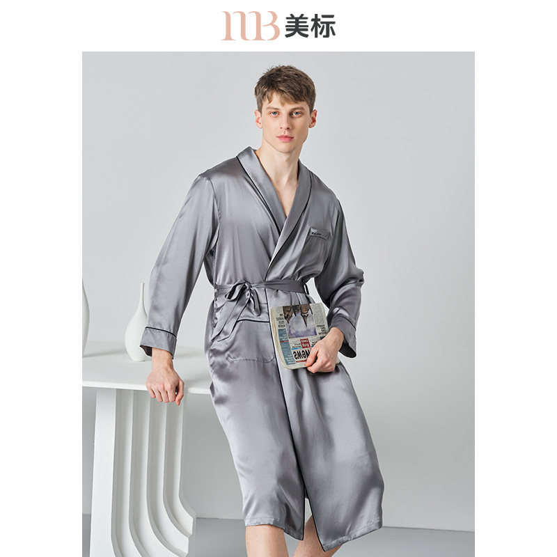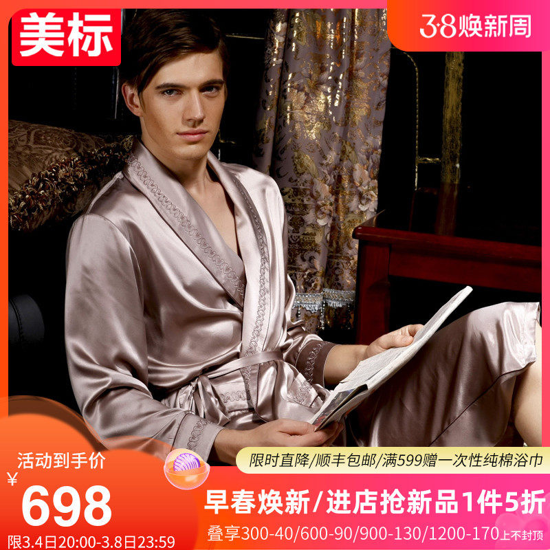 美标秋季长袖真丝晨袍男士睡袍浴袍春夏100%桑蚕丝睡衣时尚家居服