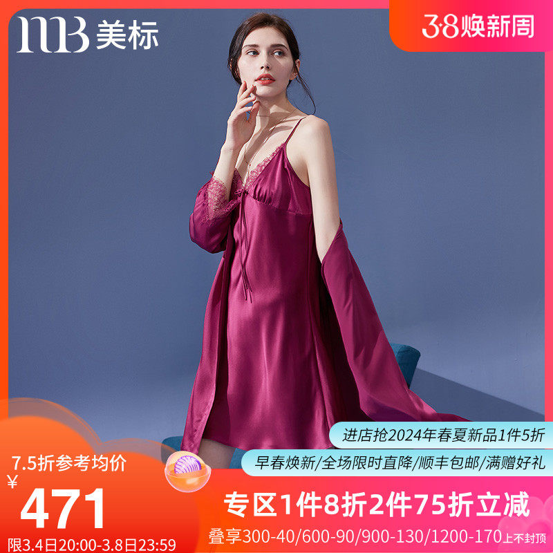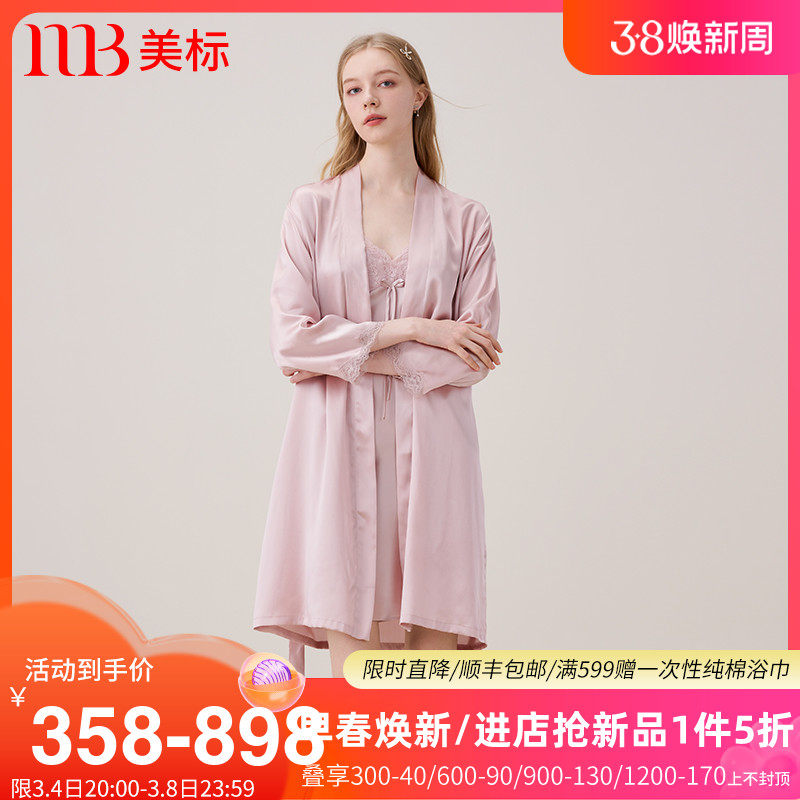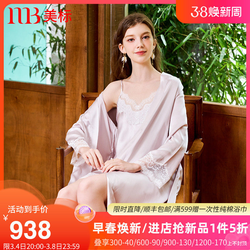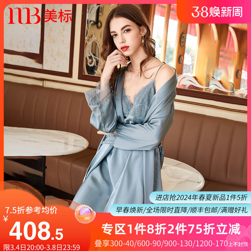 美标真丝吊带睡裙睡袍两件套女秋新款性感蕾丝睡衣桑蚕丝晨袍浴袍