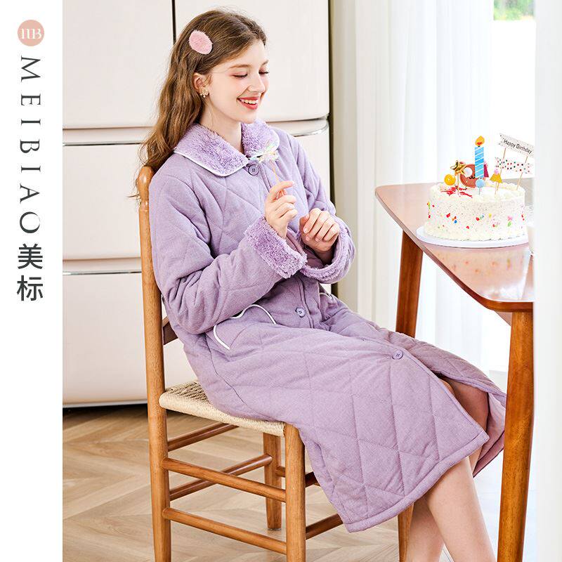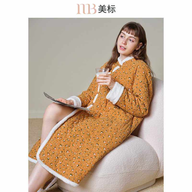 美标三层加厚保暖夹棉睡衣睡袍女秋冬全棉质浴袍可外穿纯棉家居服