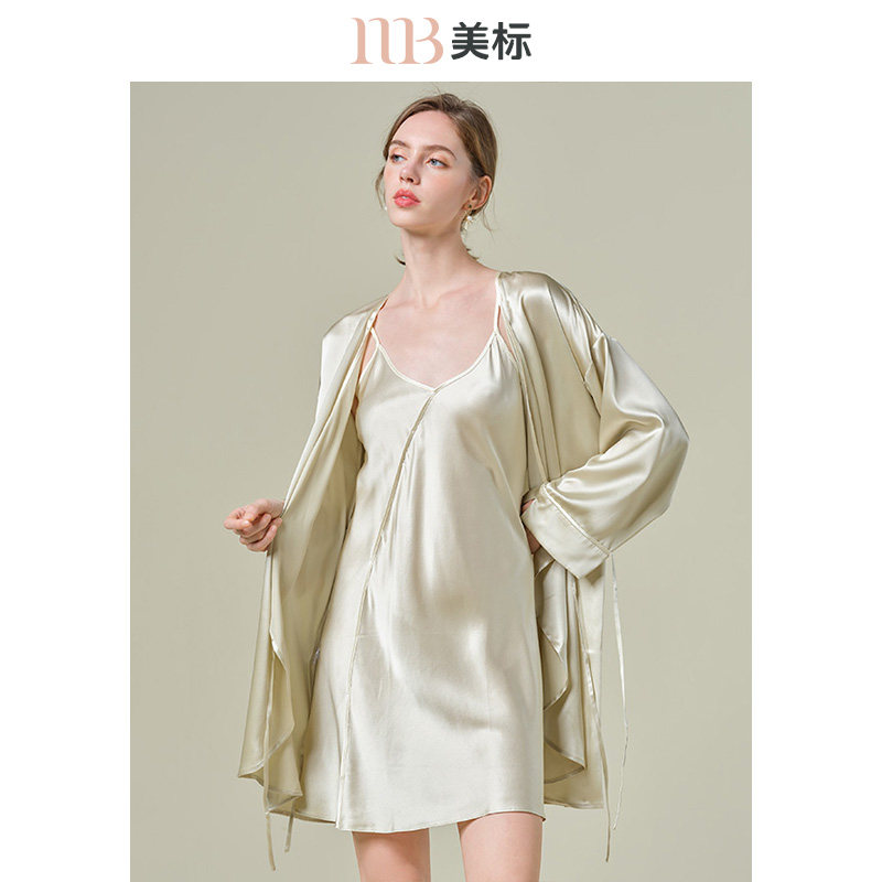 美标新款吊带真丝睡袍两件套女夏丝绸睡衣浴袍100%桑蚕丝睡裙春秋