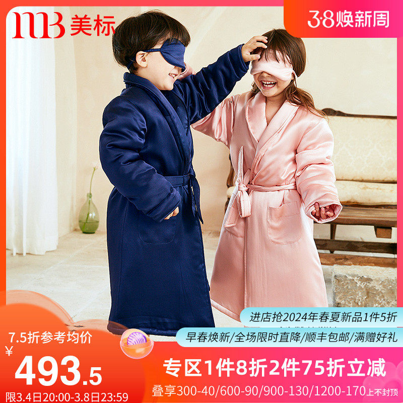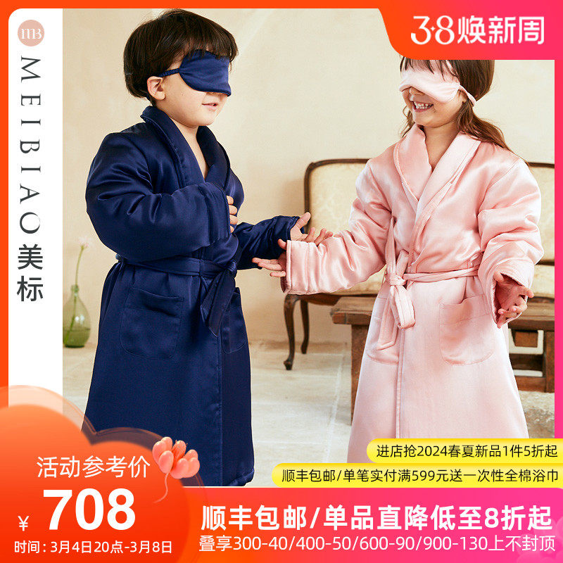 美标大童真丝夹棉睡袍浴袍女童秋冬桑蚕丝睡衣儿童丝绸家居服男孩