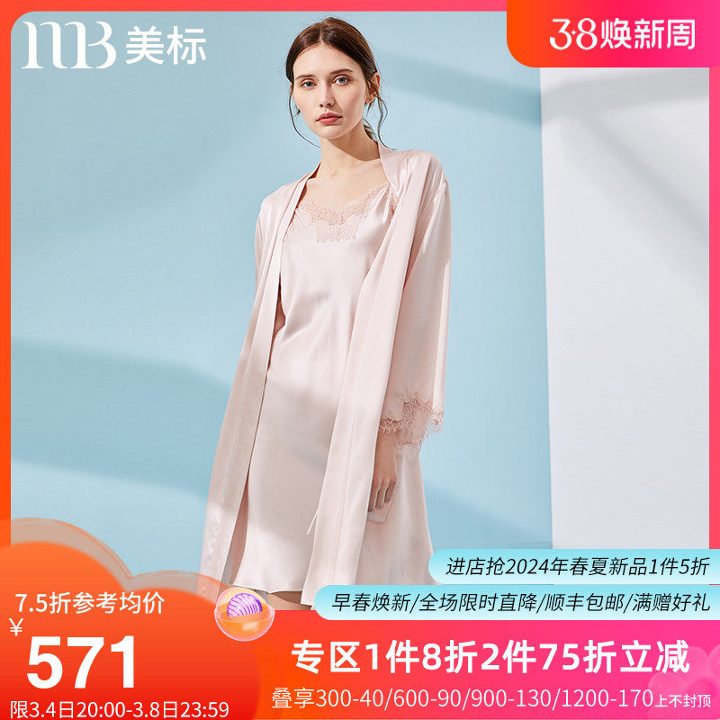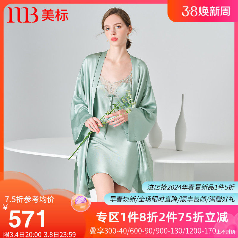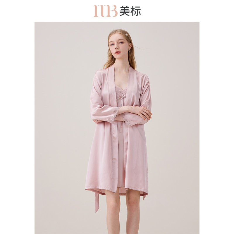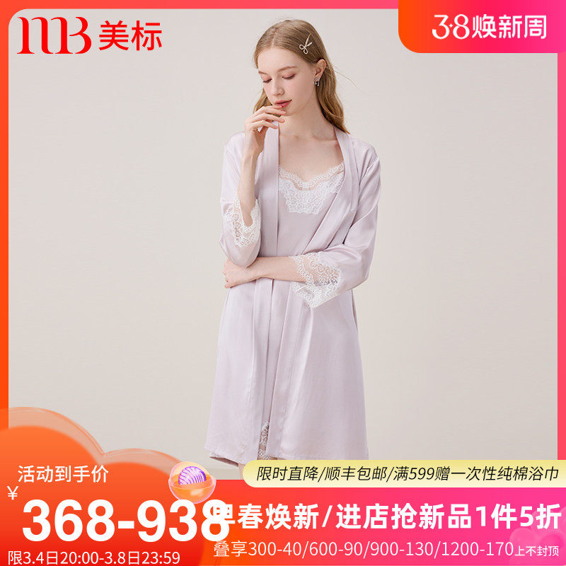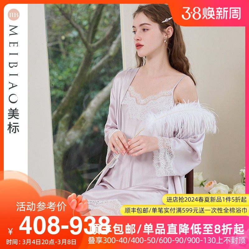 美标真丝吊带睡裙睡袍两件套女春夏丝绸睡衣蕾丝浴袍桑蚕丝家居服