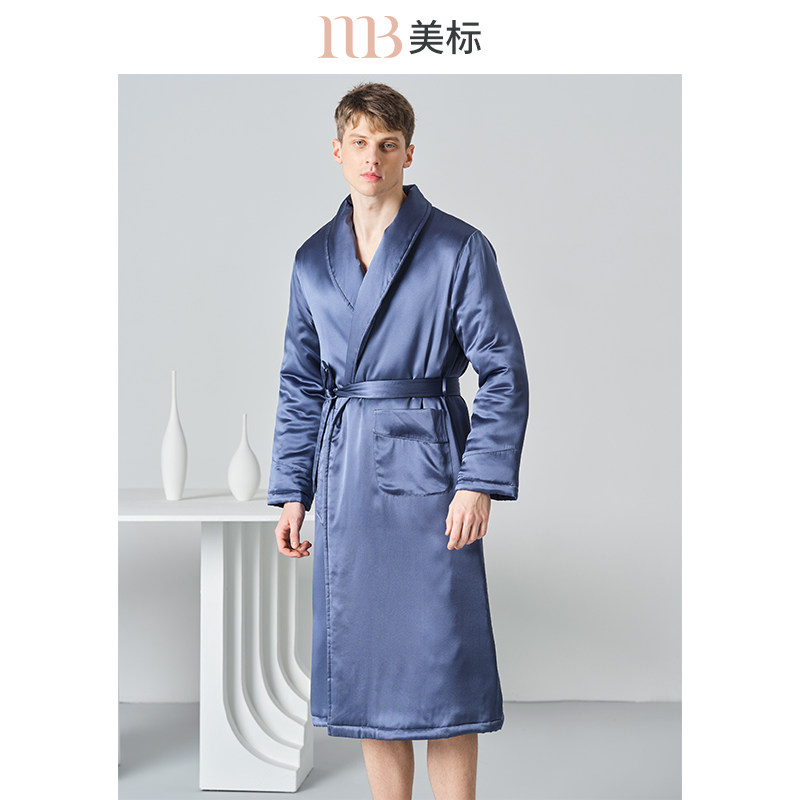 美标新款男士秋冬加厚重磅真丝夹棉睡袍桑蚕丝睡衣浴袍丝绸家居服