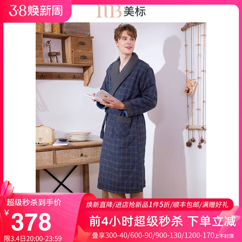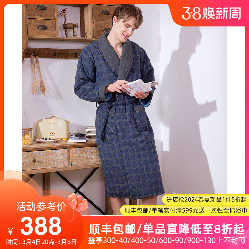 美标秋冬男士三层加厚夹棉睡衣纯棉睡袍浴袍全棉质休闲格子家居服