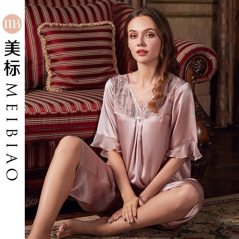 美标官方旗舰店夏款女士真丝睡衣套装七分袖长裤100%桑蚕丝家居服