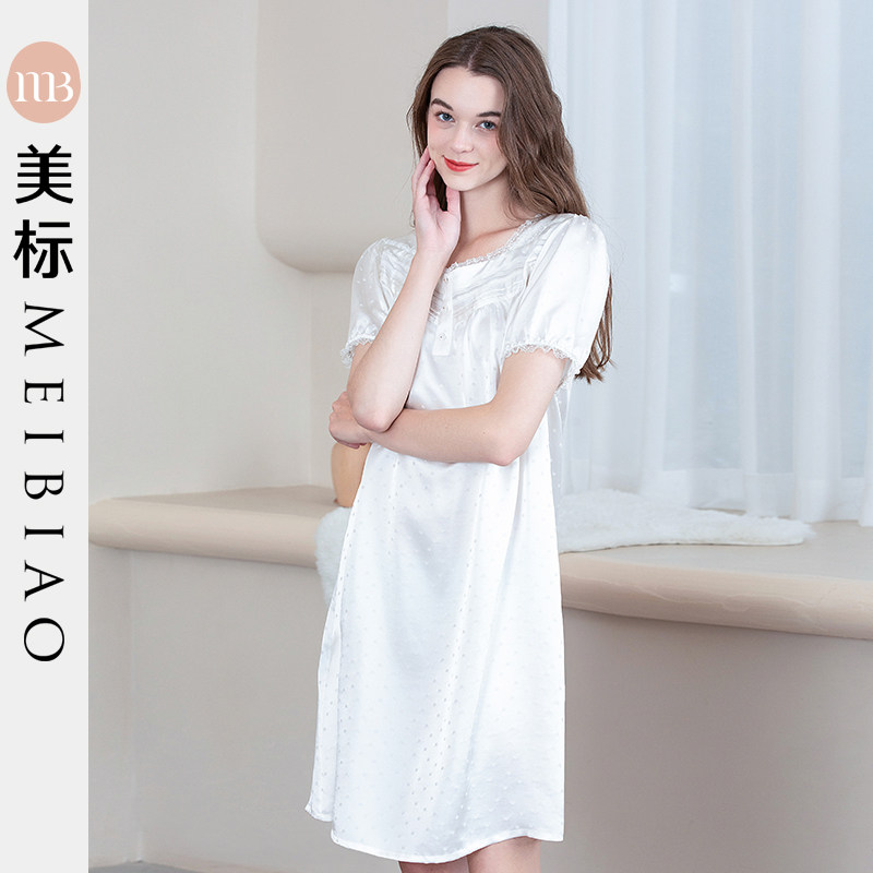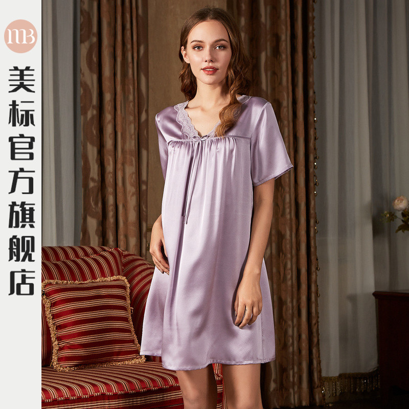 美标旗舰店夏季重磅真丝女士新款短袖睡裙100%桑蚕丝家居服睡衣
