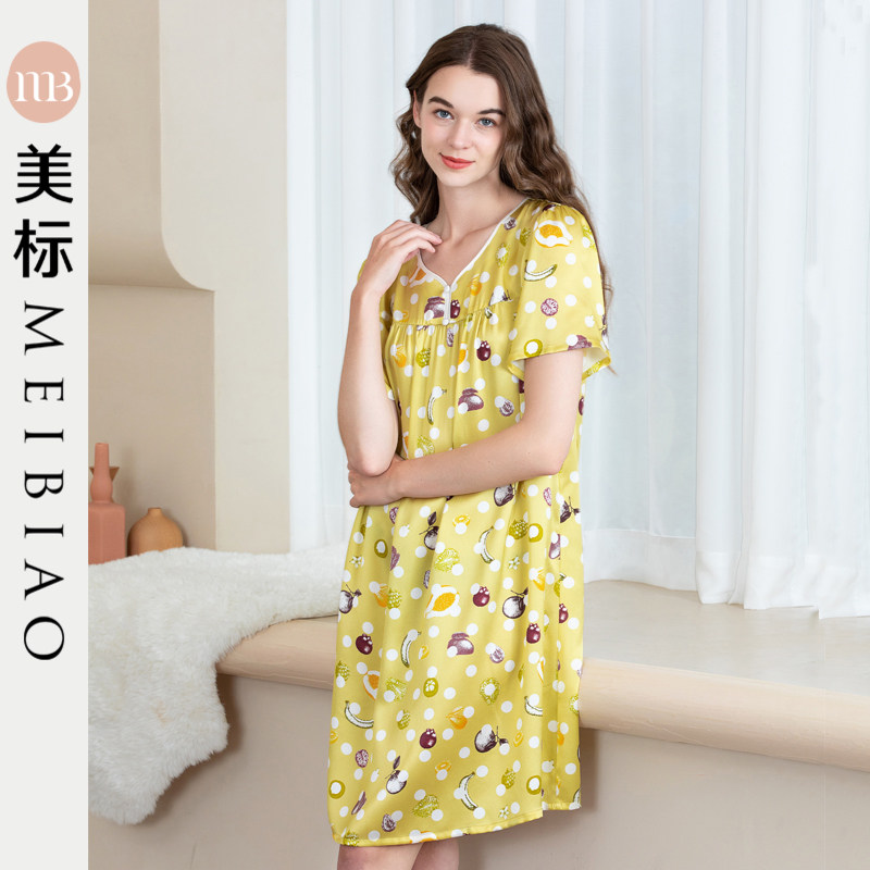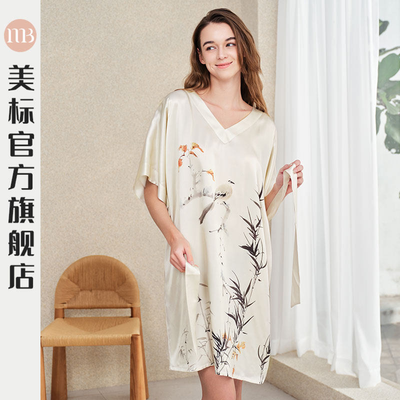 美标旗舰店睡衣夏季新品女士真丝短袖睡裙宽松100%桑蚕丝家居服