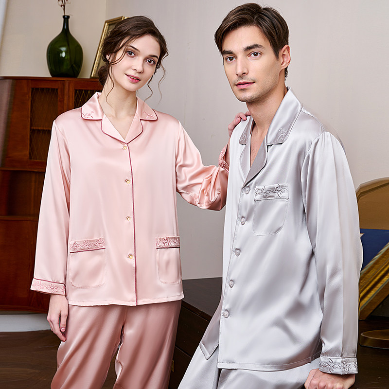 美标真丝睡衣丝绸 19姆米100%桑蚕丝男女情侣家居服套装