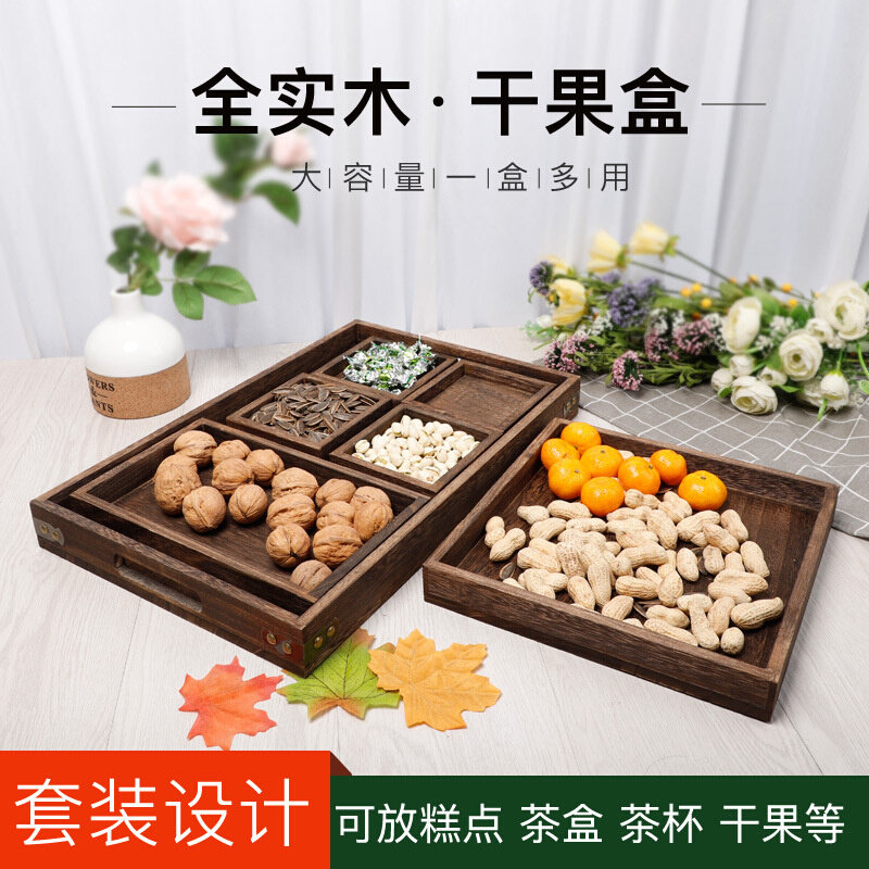 速发干果家用水果盒实木复古托盘中式零食果盘日式婚庆糖果分格盒