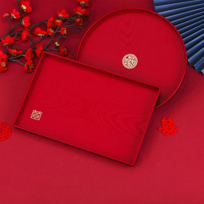 直供结婚红色圆形木质托盘婚礼敬茶实木盘子家用客厅茶几喜糖果盘