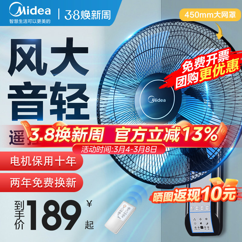 美的电风扇壁扇挂壁家用壁挂式挂墙壁摇头工业遥控餐厅大风力电扇