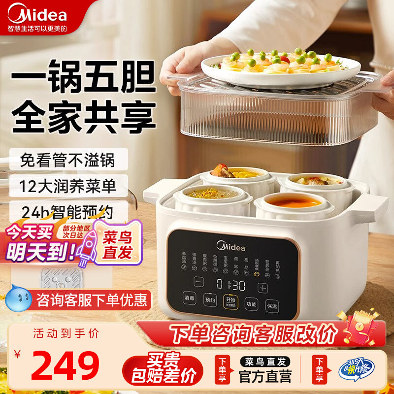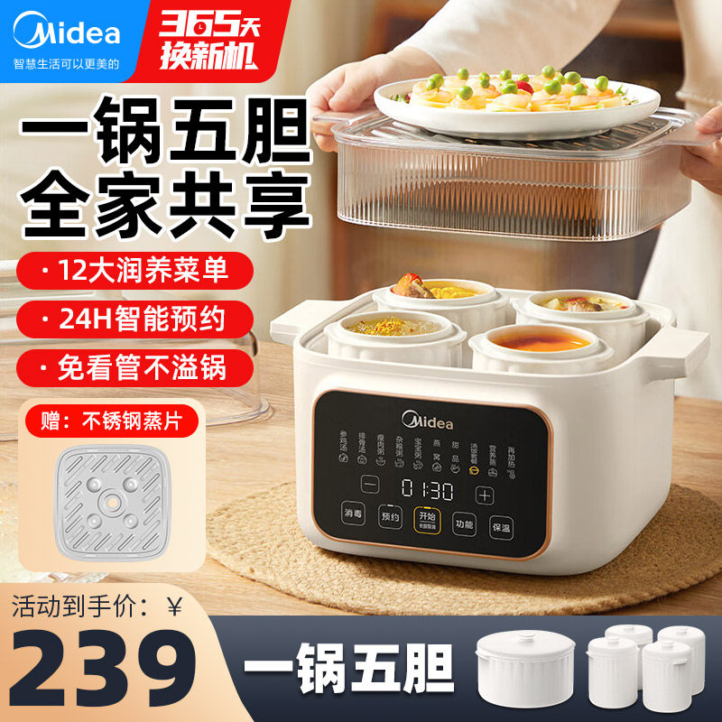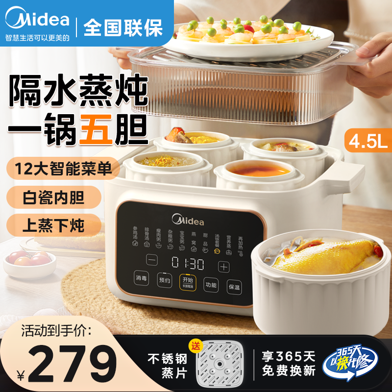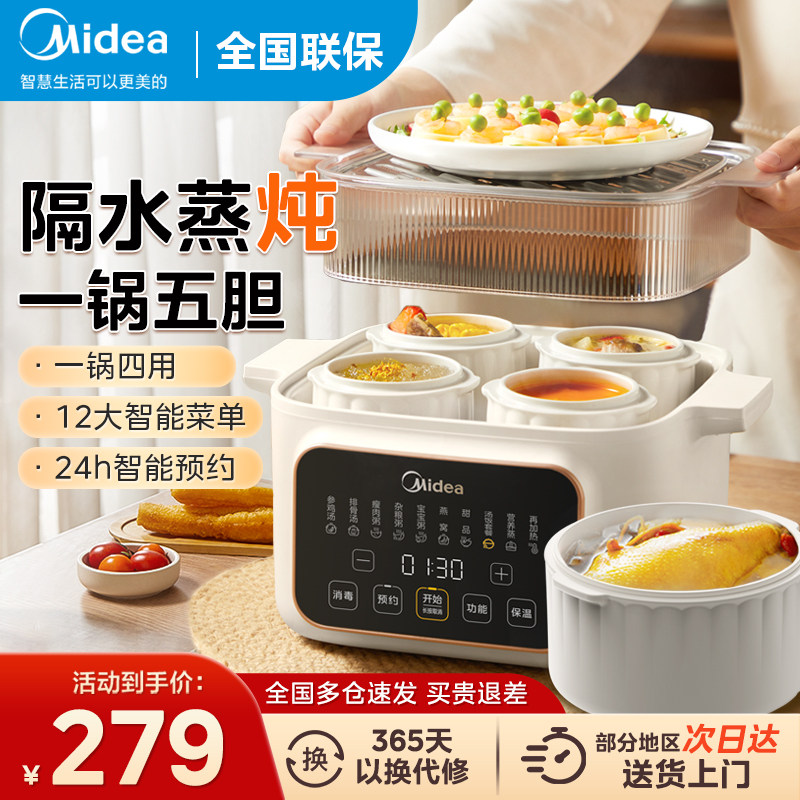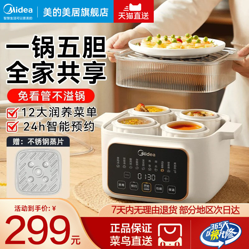 美的 电炖锅电炖盅 煲汤锅 4L大容量 1锅4胆 智能预约定时 TGS40W