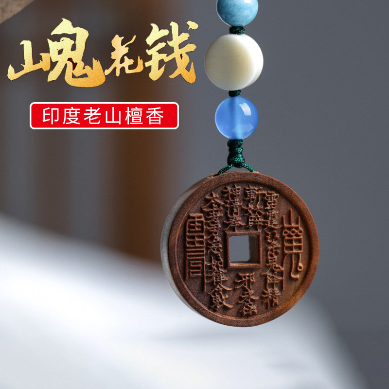 老山檀香木质山鬼花钱汽车钥匙扣吊坠男女手机项链八卦平安扣挂件