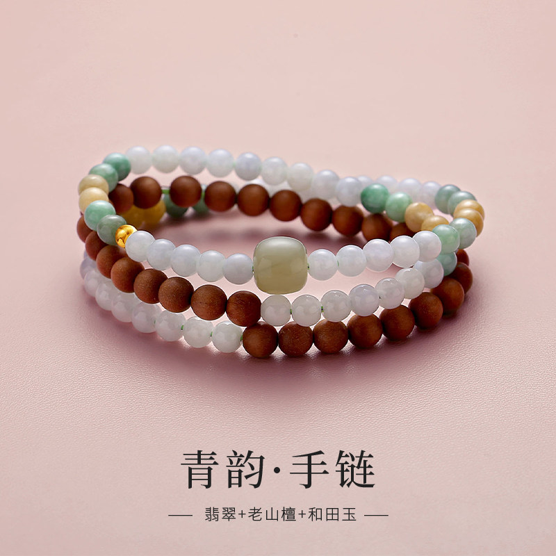 天然翡翠圆珠手串三圈多宝老山檀木质手链999足金黄金转运珠手饰