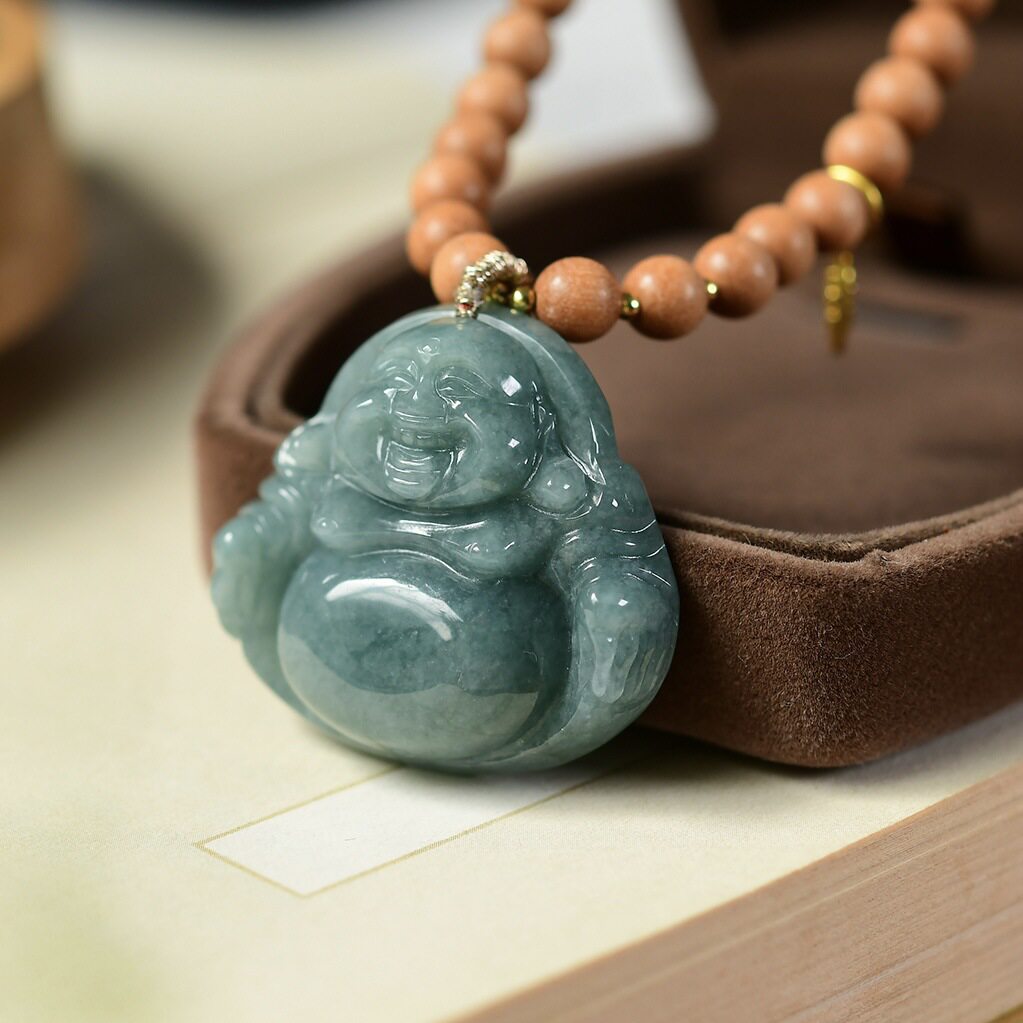 秋冬新款毛衣链天然蓝水翡翠弥勒佛公玉石吊坠女款文玩老山檀项链