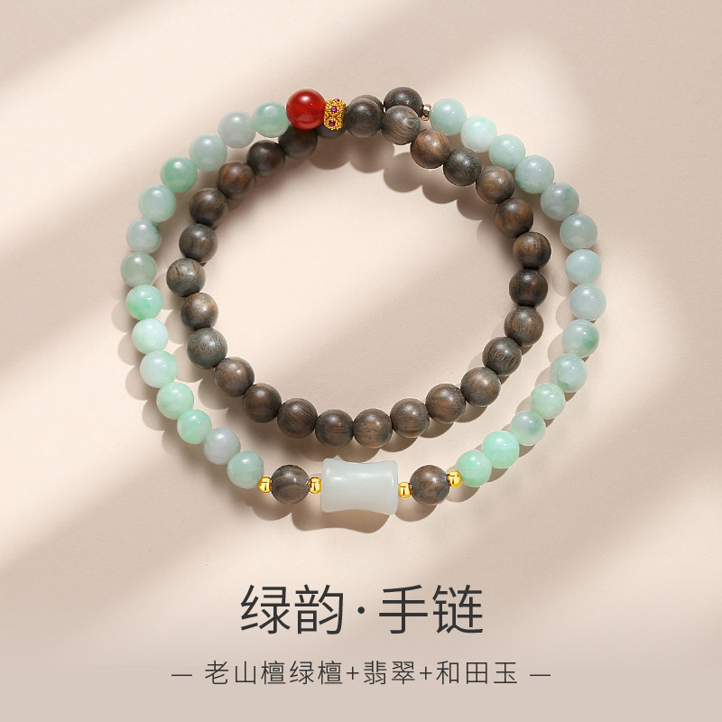天然翡翠老山檀绿檀木手串女双层珠子和田玉小蛮腰路路通多宝手饰
