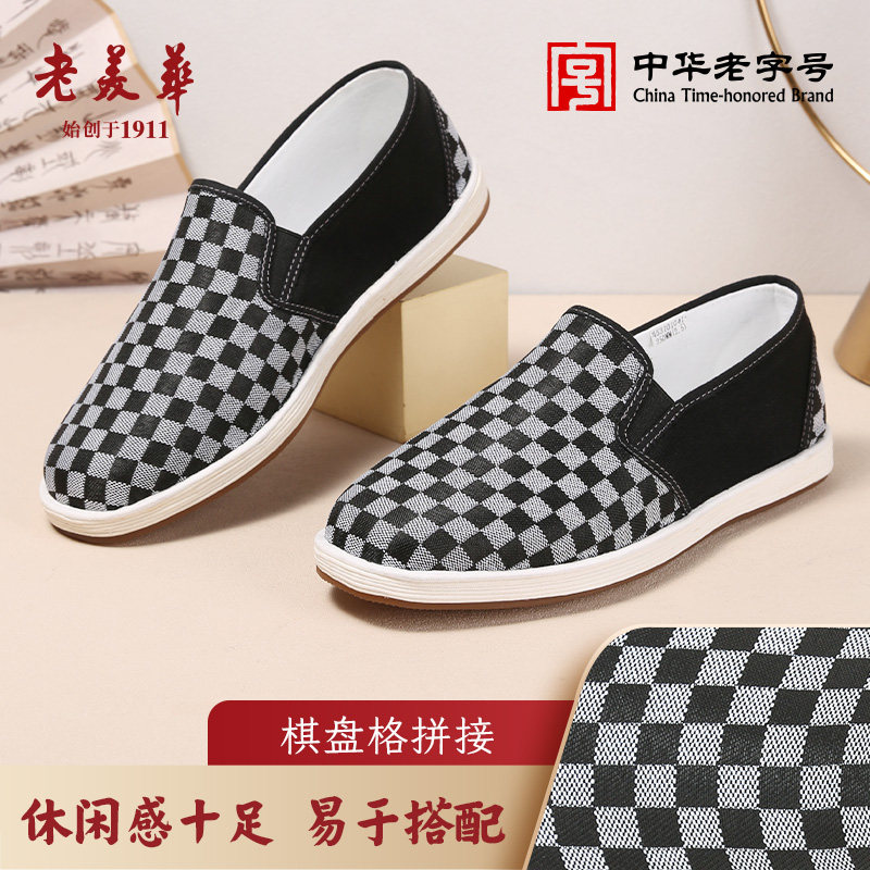 老美华春季老北京布鞋男款仿千层底一脚蹬男鞋爸爸休闲鞋子千鸟格