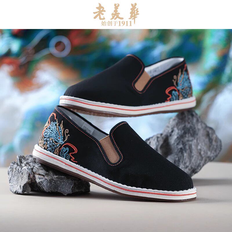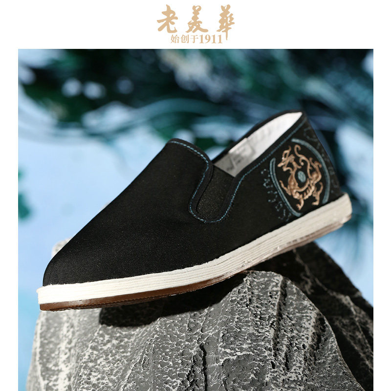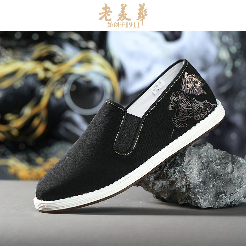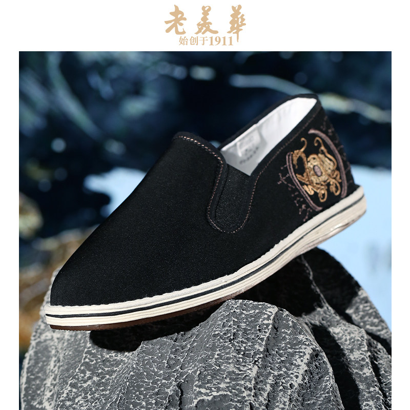 老美华春季新款老北京布鞋男款千层底一脚蹬男鞋子中国风饕餮刺绣