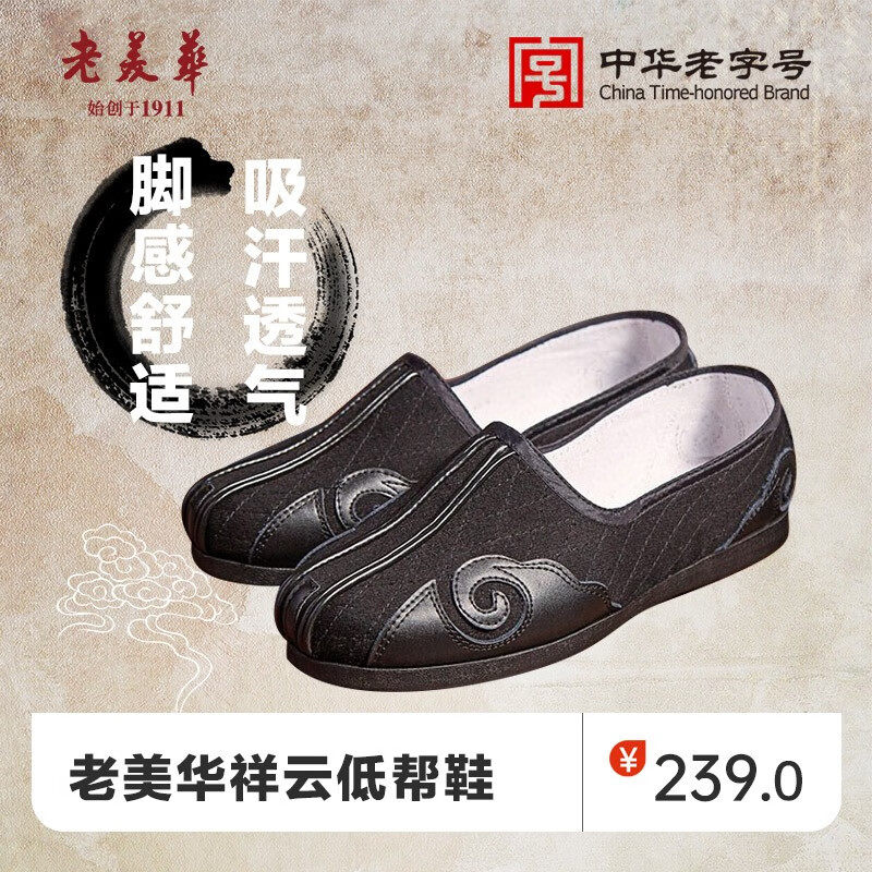 老美华【手工制作】常年经典款老北京传统祥云洒低帮中国风男鞋黑