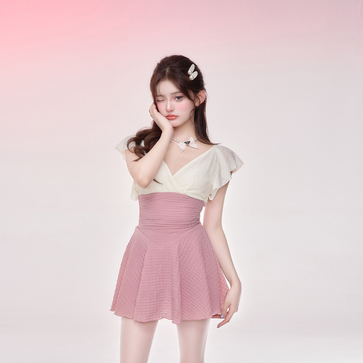 保守泳衣女2023夏新款温泉连体小胸抽褶显瘦遮肉纯欲风绳结纹粉色