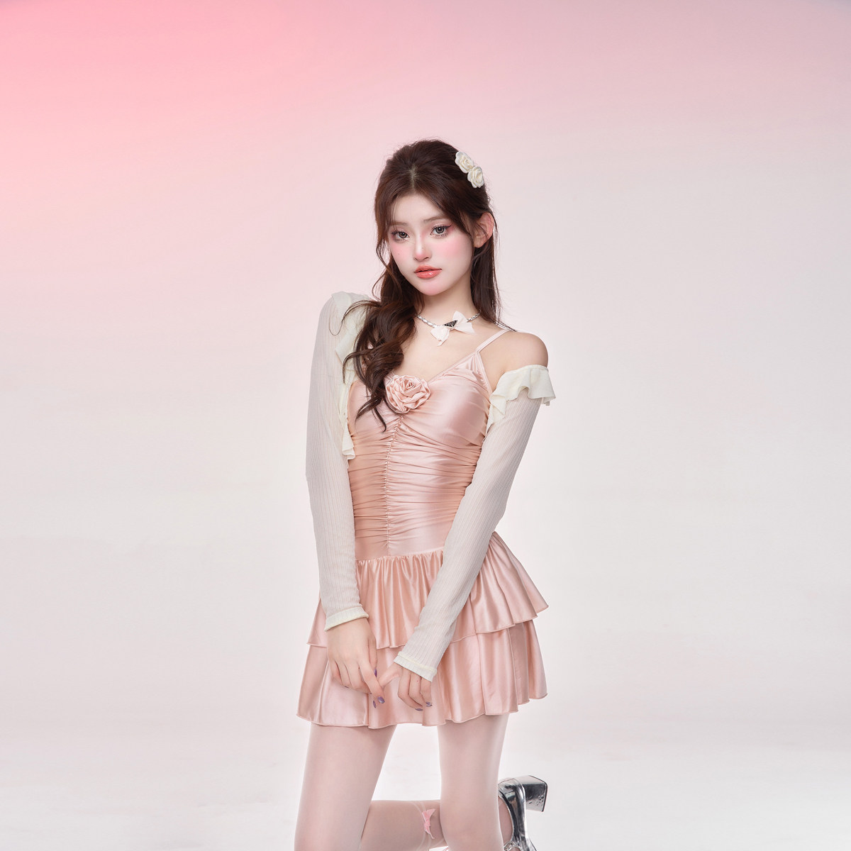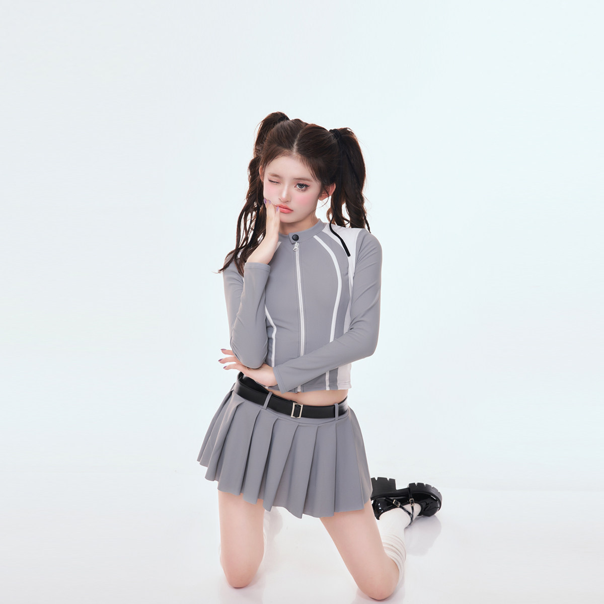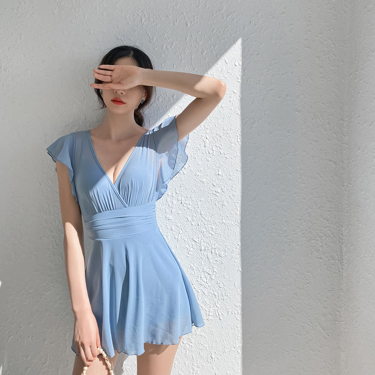 张婧仪同款泳衣长袖遮肚聚拢连体裙式仙气时尚防晒遮肉保守白色