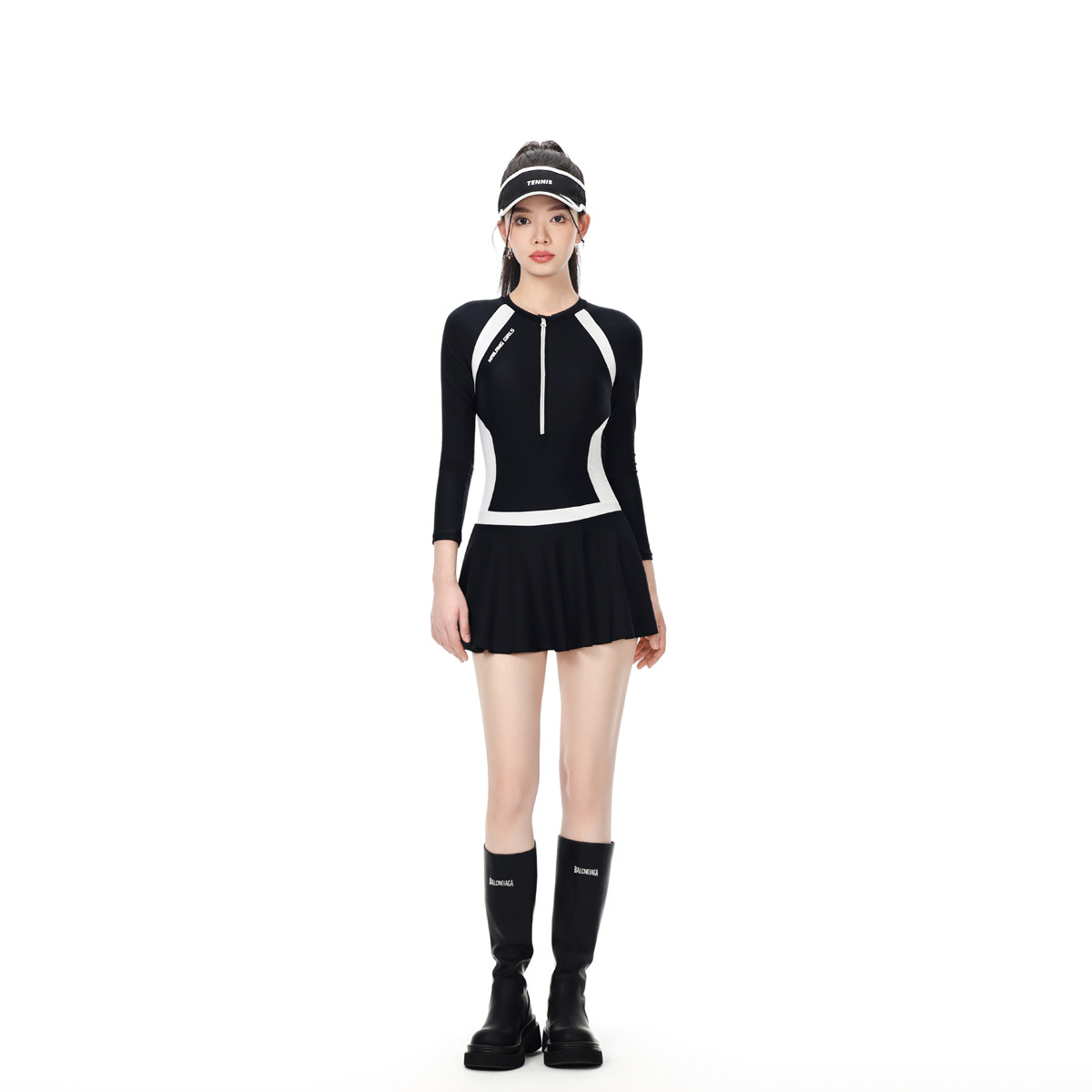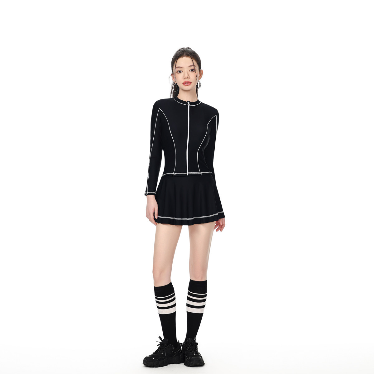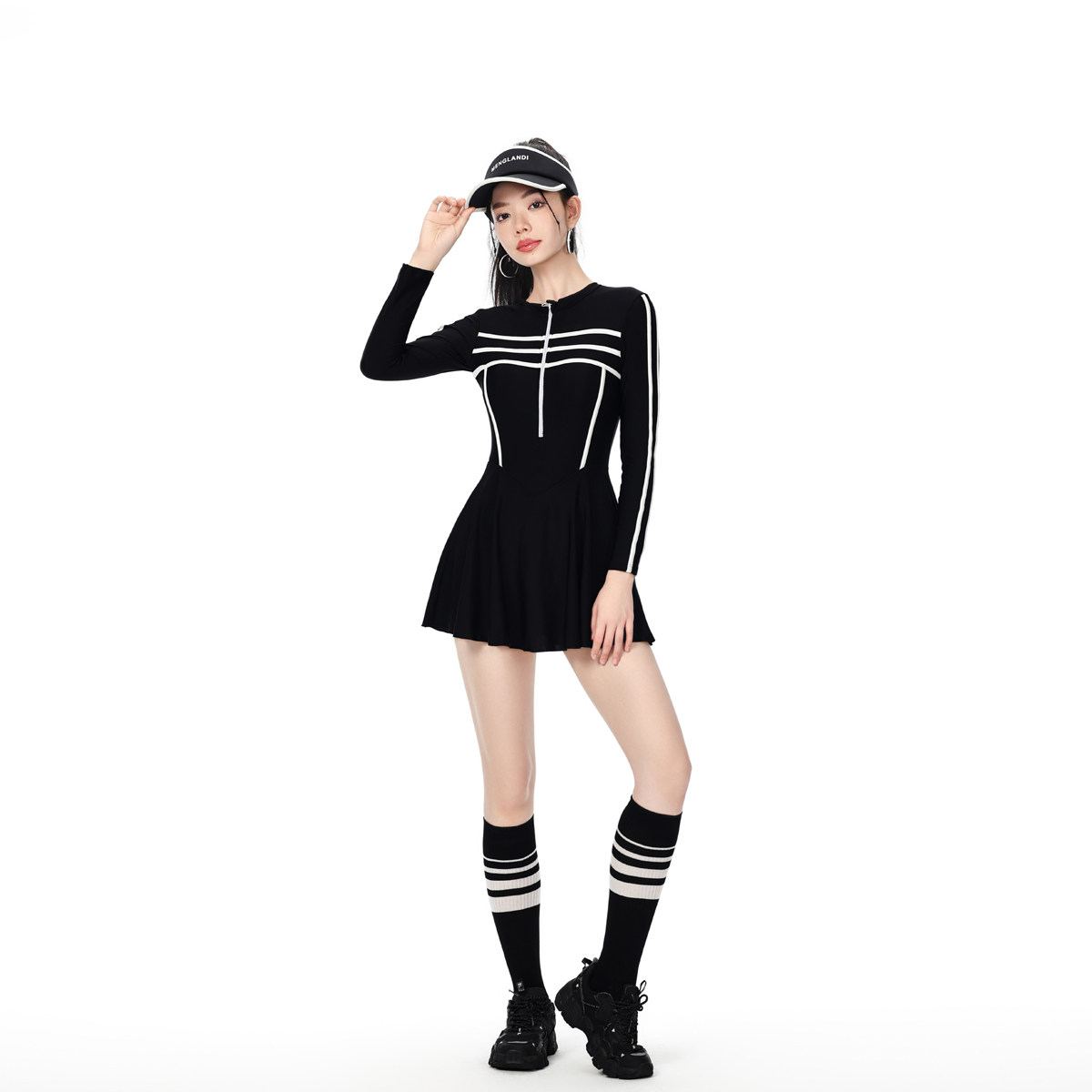 NAILANG泳衣女连体温泉新款度假长袖防晒遮肚显瘦运动拼色黑白游