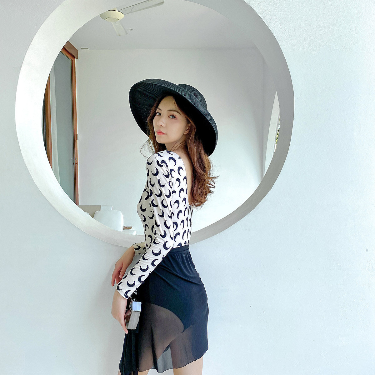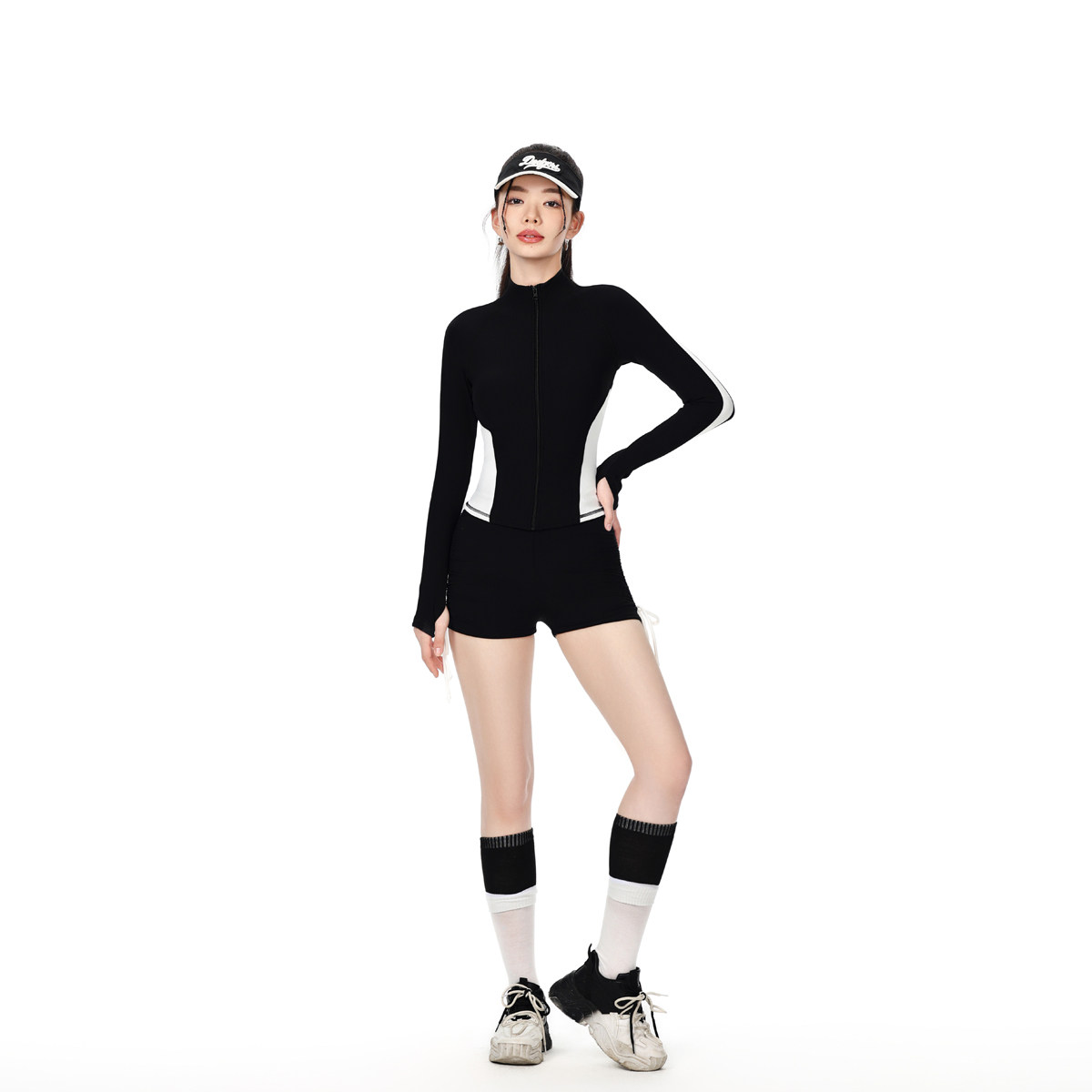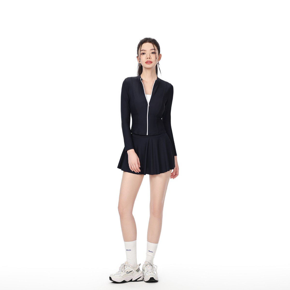 NAILANG泳衣女连体温泉新款度假长袖防晒遮肚显瘦运动拼色黑白游