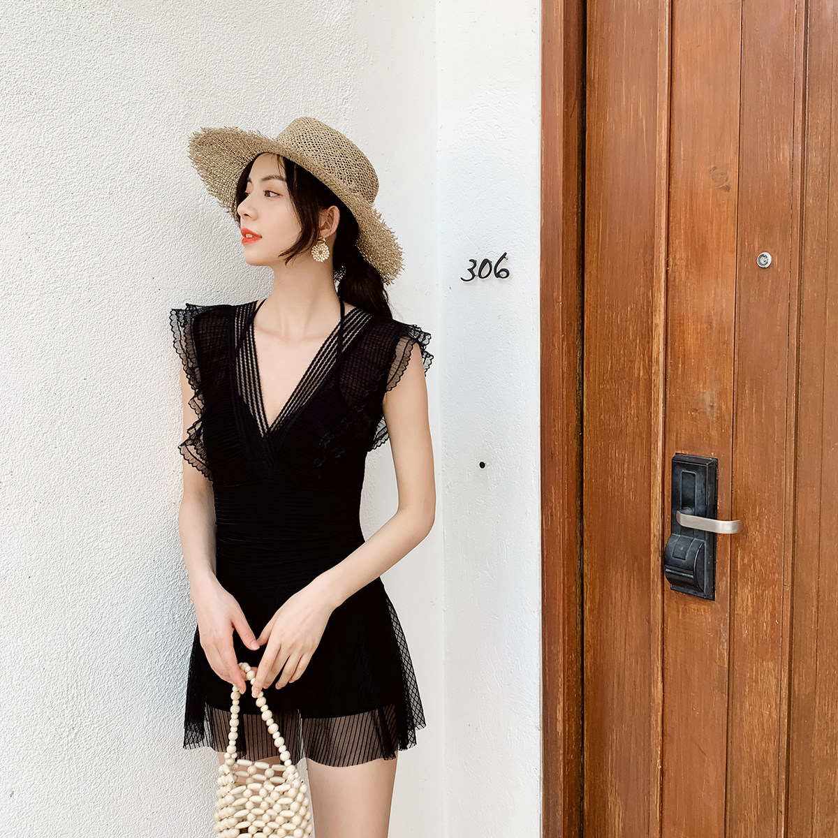 NAILANG泳衣女2024新款小众薄纱荷叶边仙气连体泡温泉服海边拍照