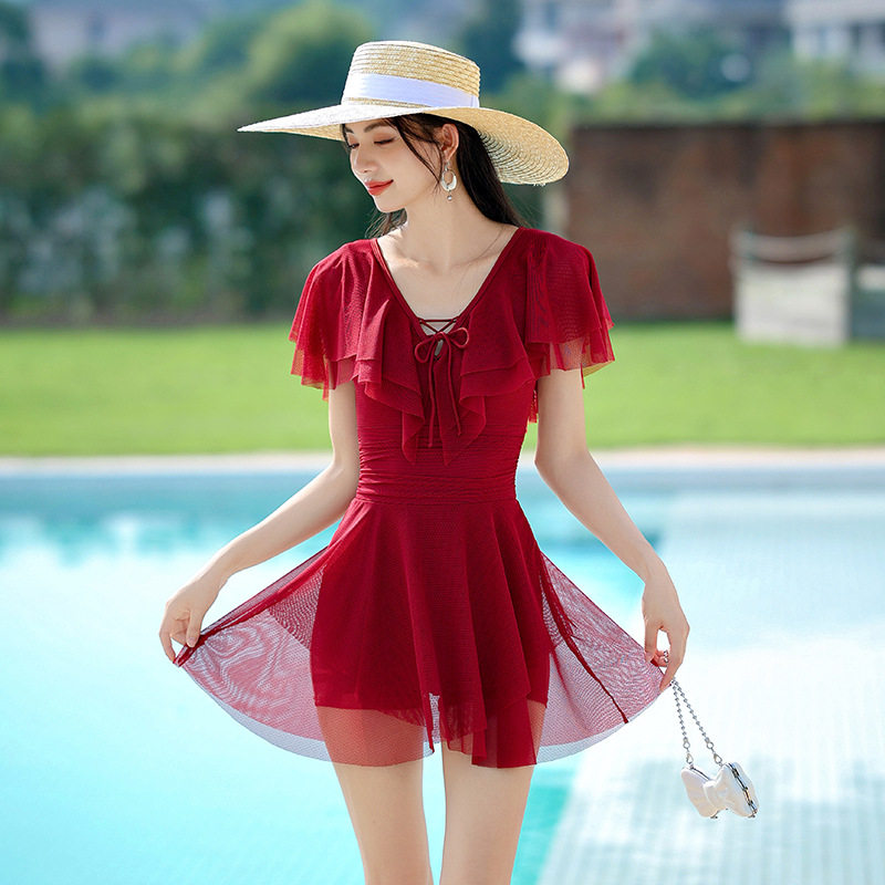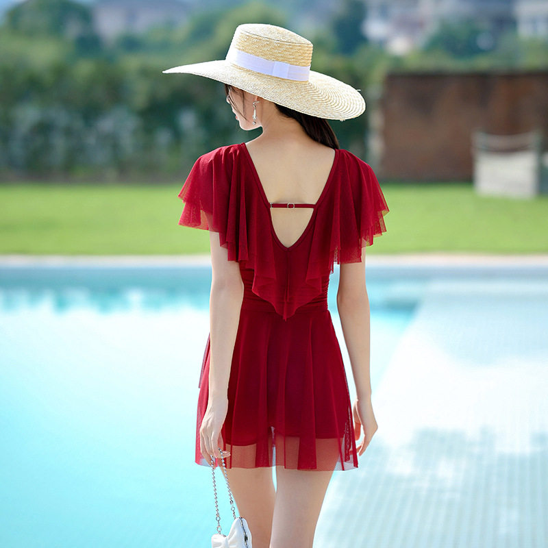 温泉泳衣女吊带遮肚连体裙式性感薄纱飞袖带胸垫无钢托2023新款