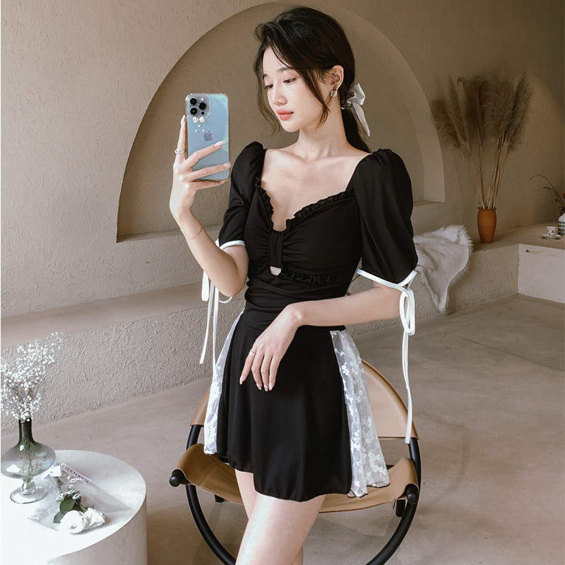 耐浪新品ins风韩国显瘦遮肚泳装保守小胸蕾丝钢托性感游泳衣温泉