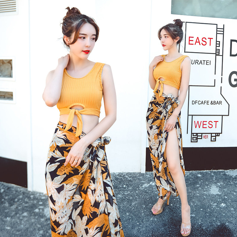 新款女三件套韩国耐浪性感保守显瘦小胸聚拢长裙沙滩游泳衣姜黄色