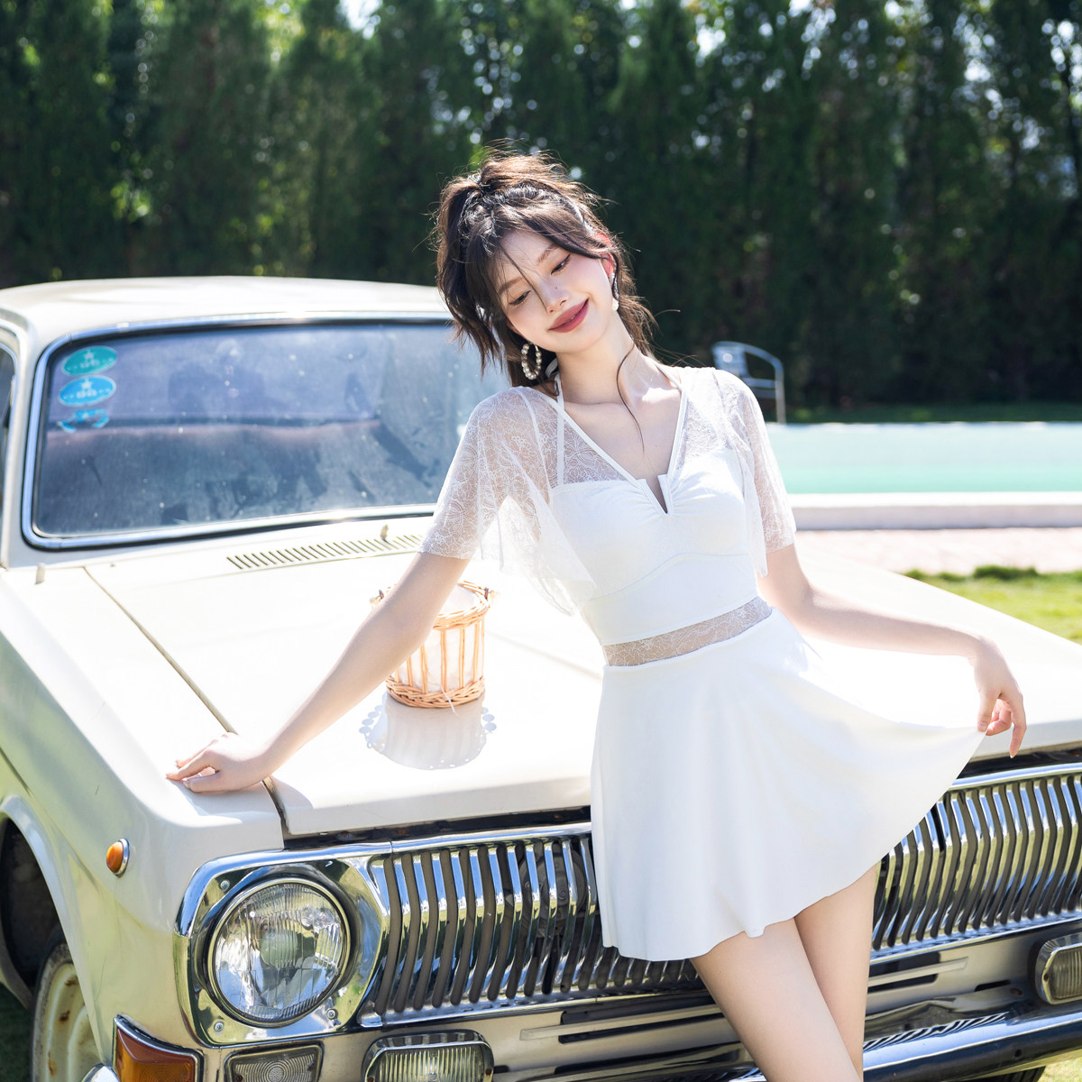 NAILANG泳衣女新款温泉拍照蕾丝裙小胸带胸垫保守甜辣高级感度假