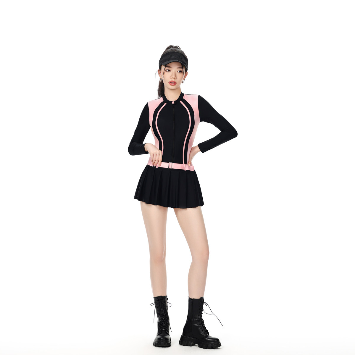 冲浪泳衣女游泳馆连体长袖显瘦纯欲拉链简约纯色海边温泉2023年夏