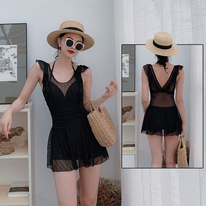 网红风泳衣女遮肚子2023新款时尚韩国ins黑色吊带裙式仙气平角裤