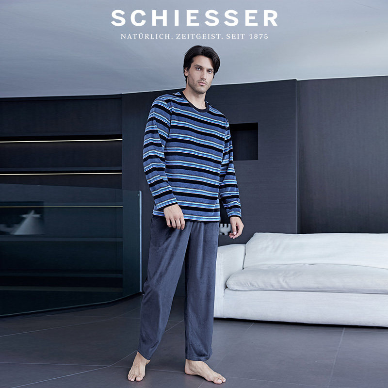 SCHIESSER舒雅男士天鹅绒条纹印花圆领睡衣家居服套装21672H